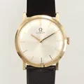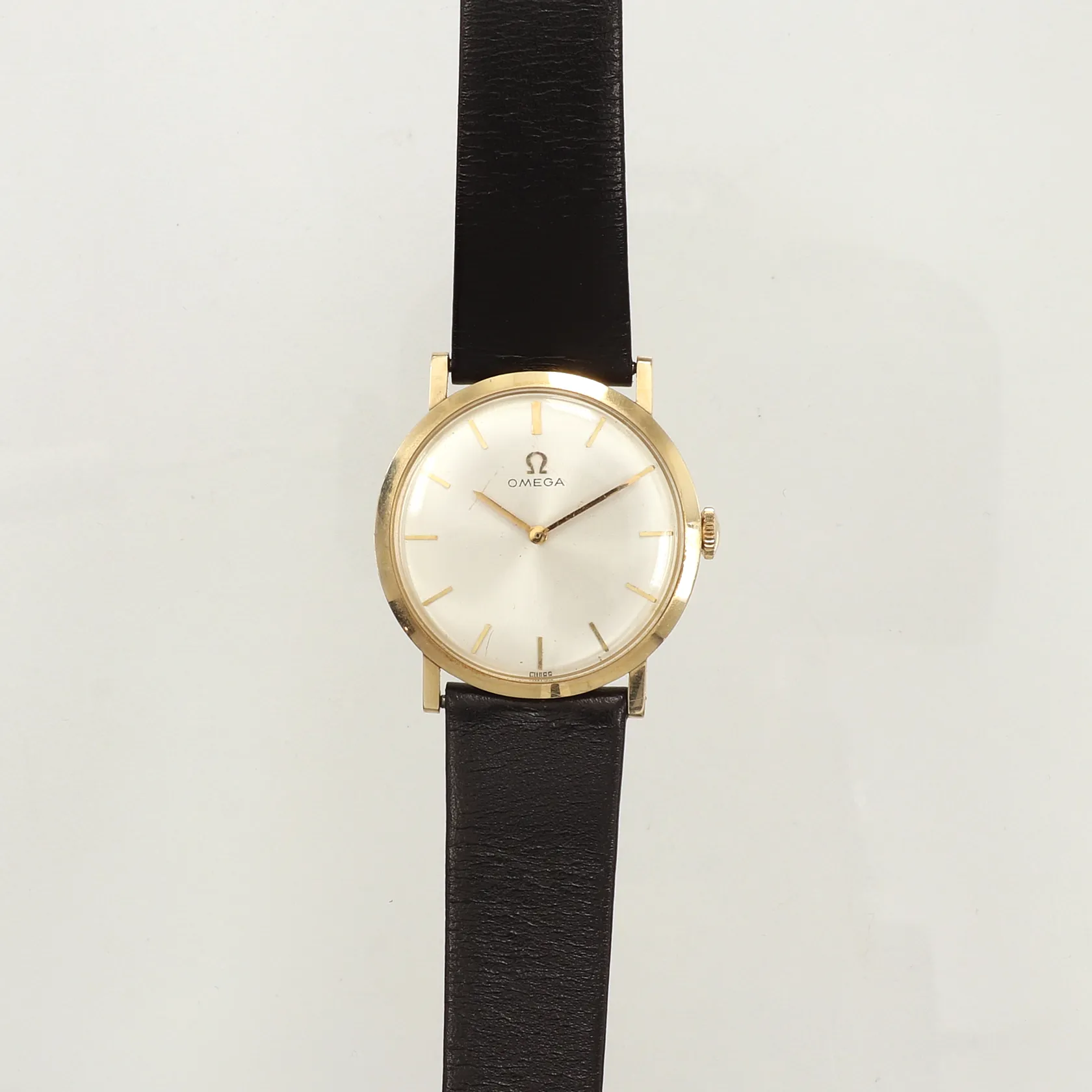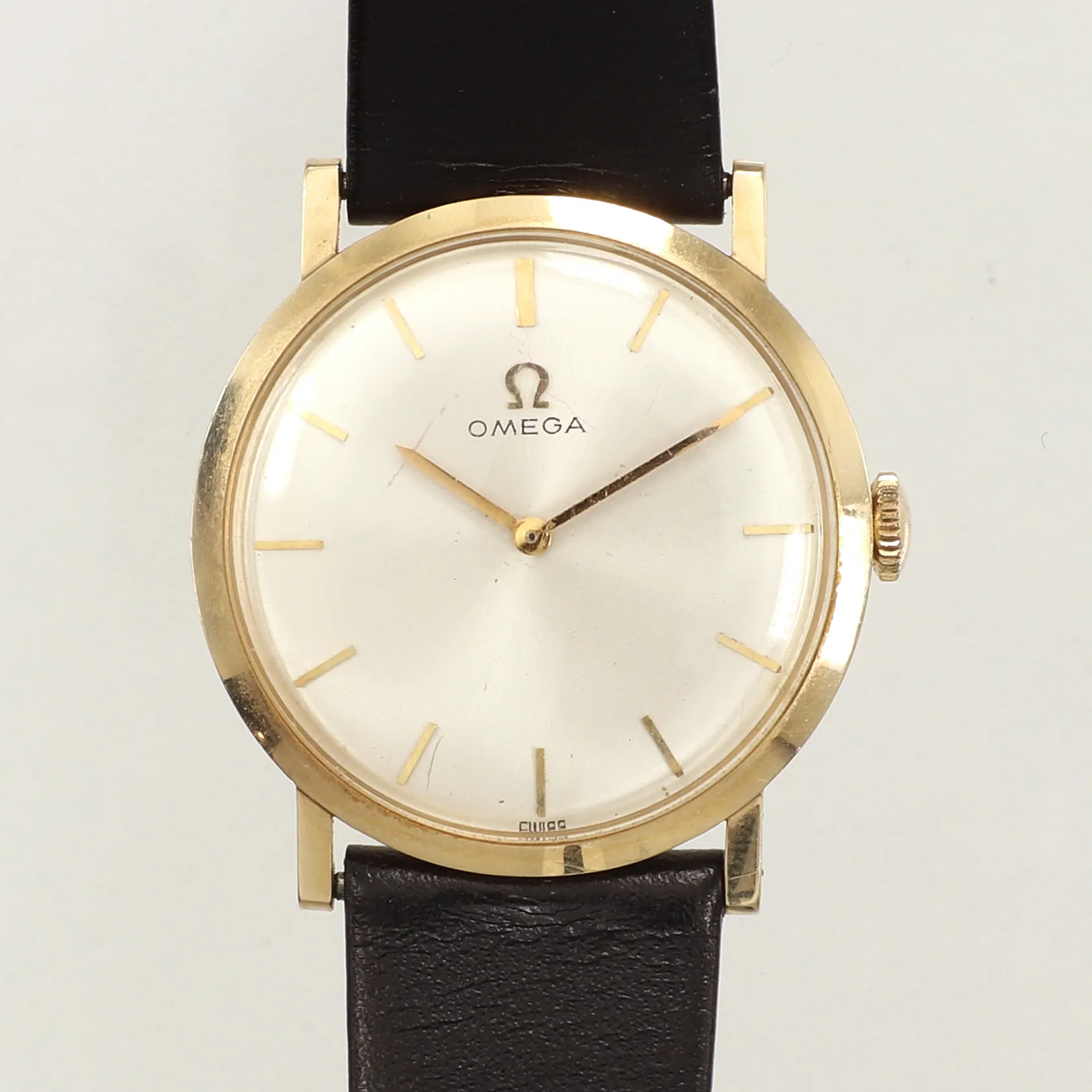 Armbandsur Omega 14K, manuell, Ø30mm, boettnr 954726, D6694, serienr 24623222, Cal 620, plexiglas, gravyr från 1967, läderarmband, bruttovikt 21g, inga tillbehör, defekt läderband, skev krona, servicebehov.