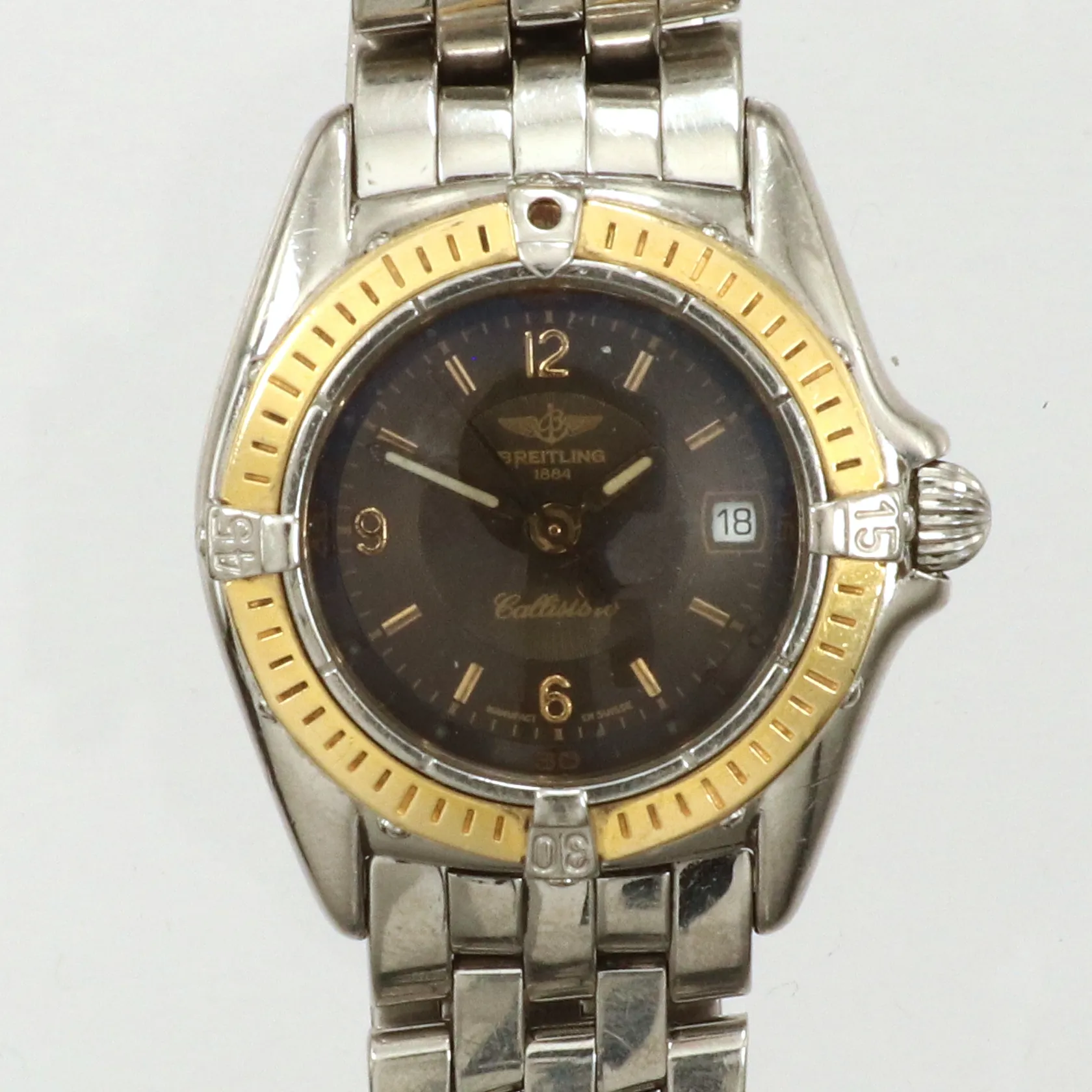 Damur Breitling Callistino, 27mm, boett stål/guld, quartz, referensnr D52045, brun urtavla, stållänk innermått inklusive ur ca 15cm, viklås, batteribyte krävs, bruksslitage, lysmassa saknas på ringen, tunna repor på glas, inga tillbehör, etui.