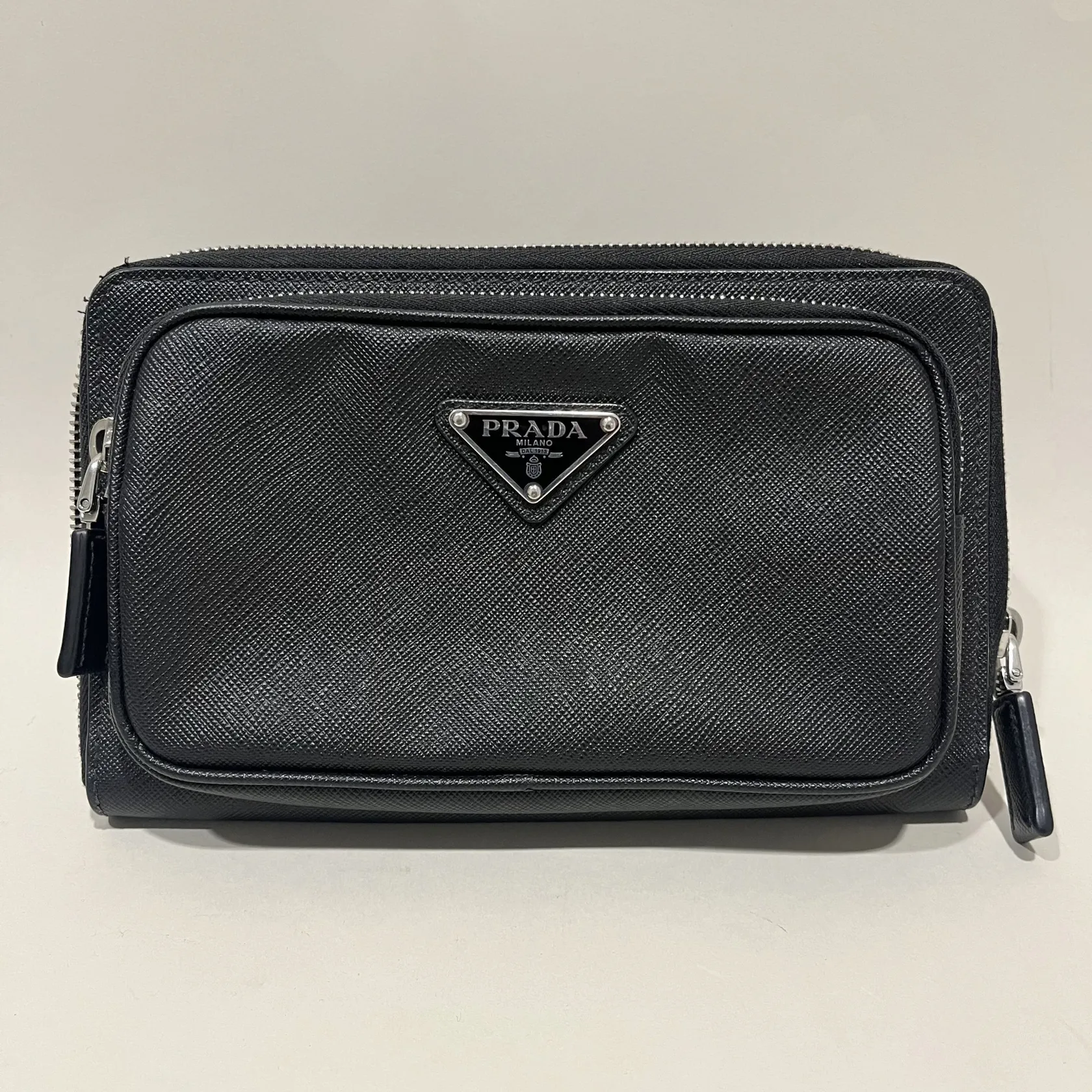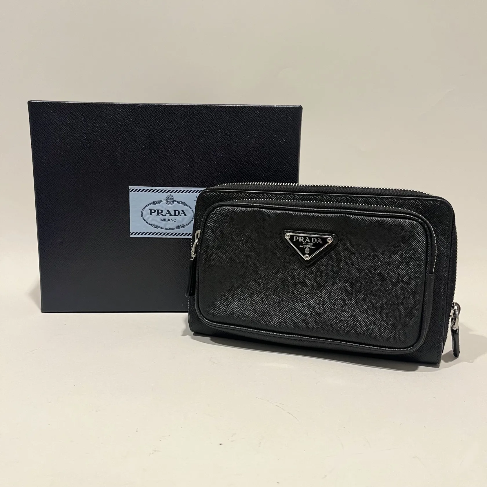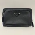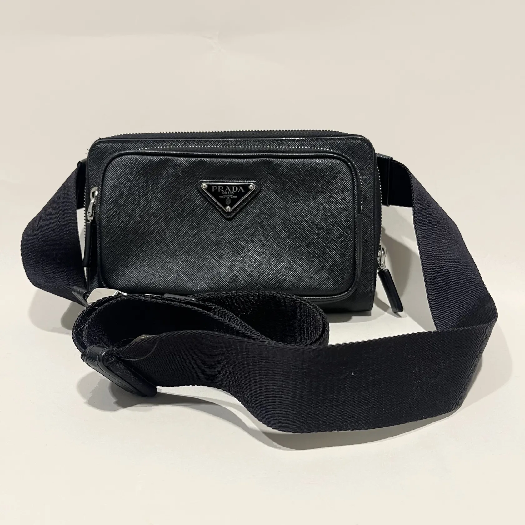Väska, Prada Saffiano Belt Bag, svart läder, 13cmx21cm, modell nr: 2VH156, detaljer i vit metall, axelrem nylon, dustbag, certifikat -22, kvitto från Birger Jarlsgatan, originalkartong. Visas hos Pantbanken Östermalm, Storgatan 8, Stockholm.