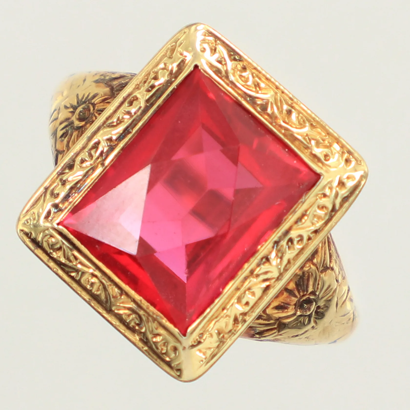 Ring med röd sten, troligen syntetisk rubin, stl 16¾, bredd 1,4-14mm, skev, 14K Vikt: 3,5 g.