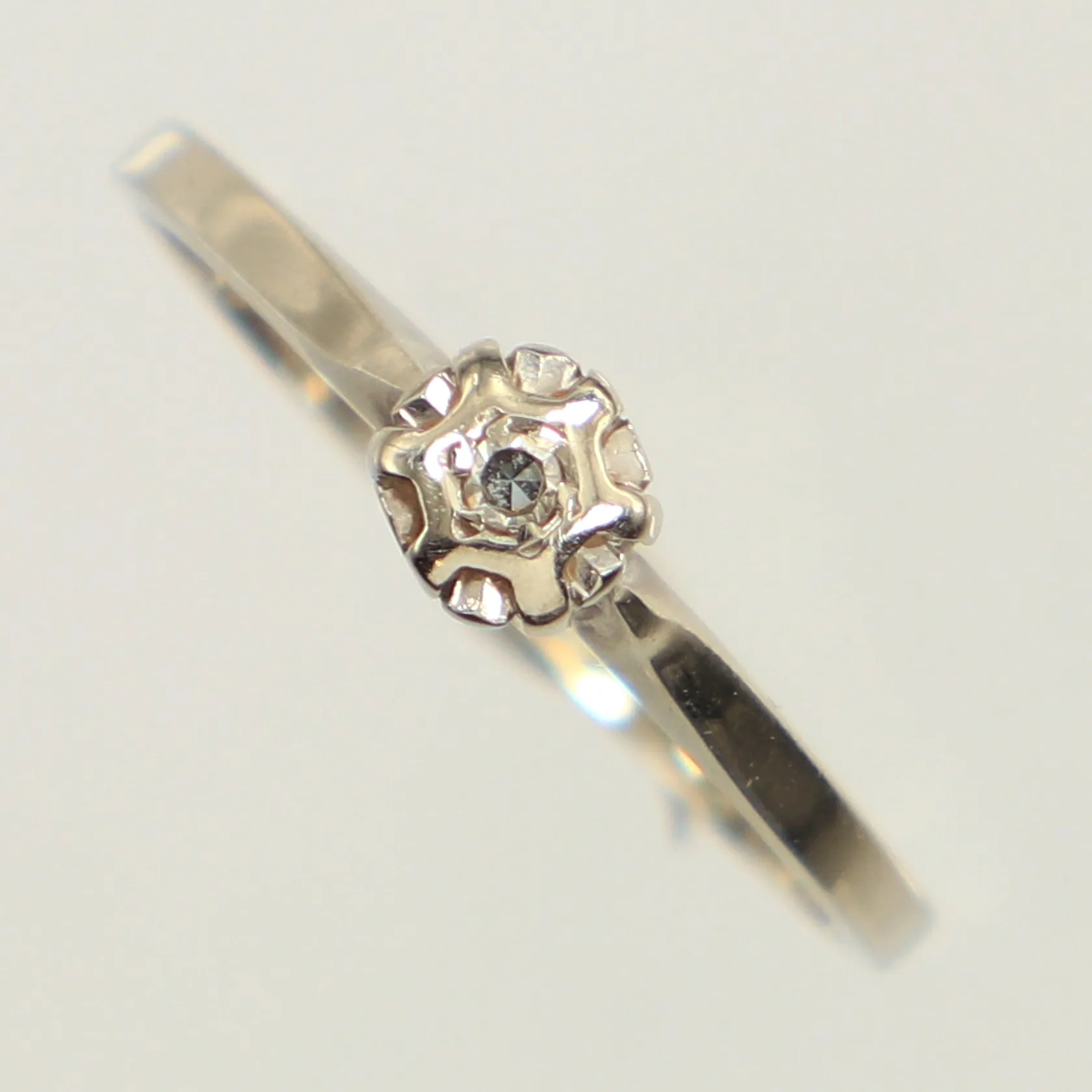 Ring med diamant ca 0,02, stl 18, bredd ca 1,5-5mm, vitguld, 18K Vikt: 1,8 g.