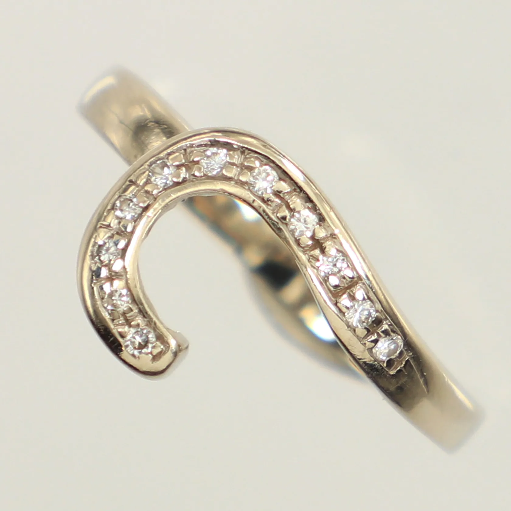Ring med diamanter ca 11 x ca 0,01ct, stl 18, bredd ca 2-10mm, vitguld, repig, 18K Vikt: 3,5 g.