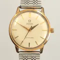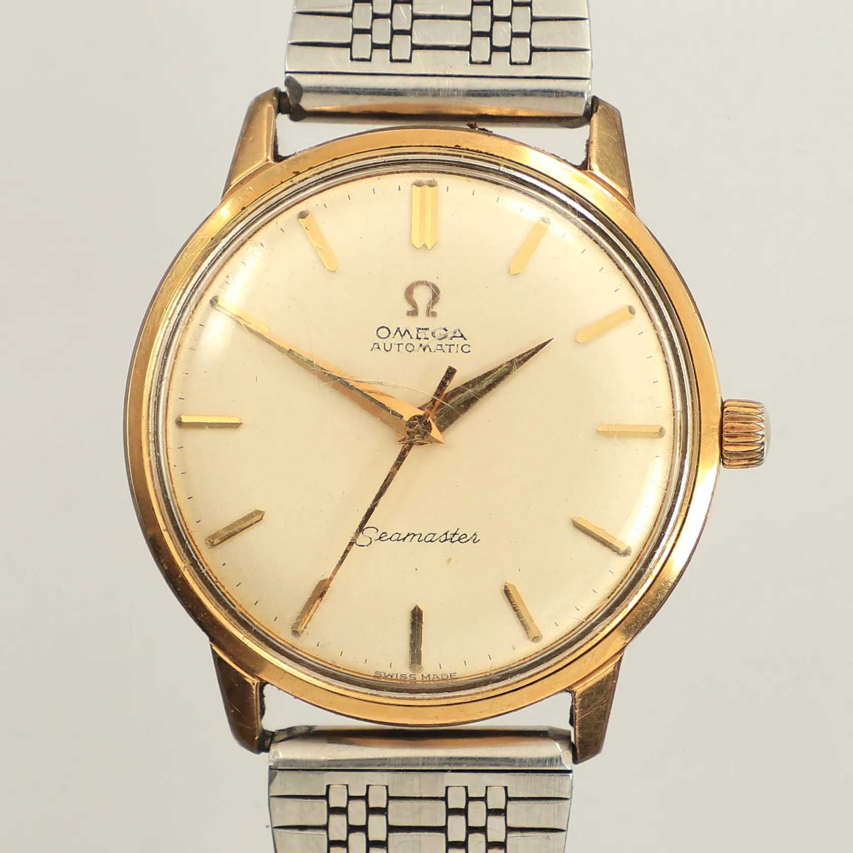 Herrur Omega Semaster, guld på stål, automat, 34mm, repigt plexiglas och boett, sliten krona troligen utbytt, stållänk ej original, inga tillbehör.
