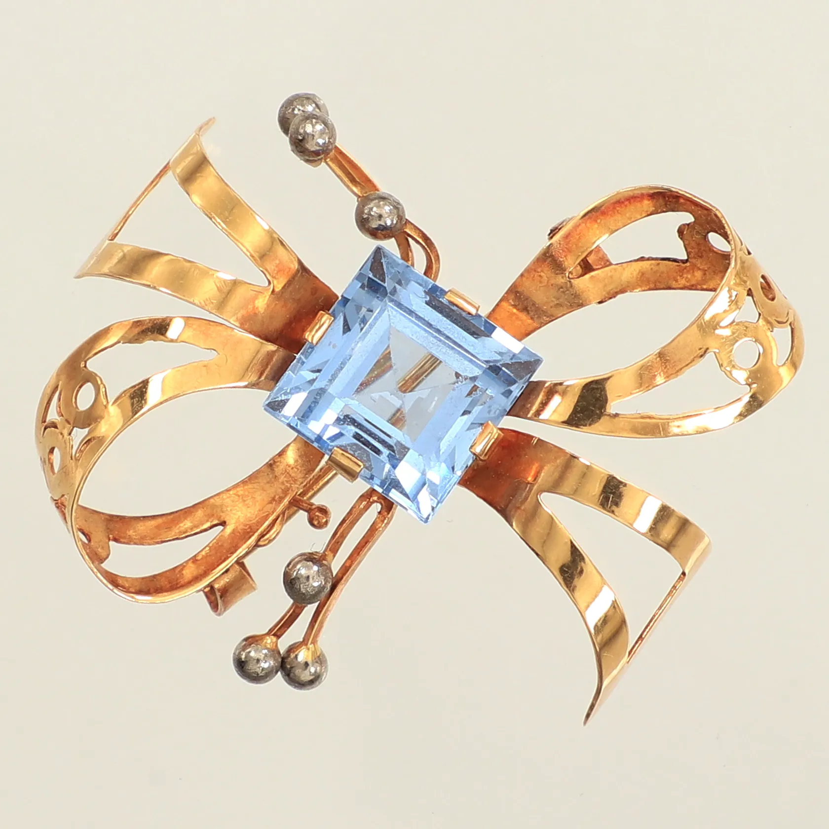 Brosch, syntetisk spinell, längd 37mm, bredd 28mm, Juvelfabriken Ab, år 1953, 18K Vikt: 5,8 g.