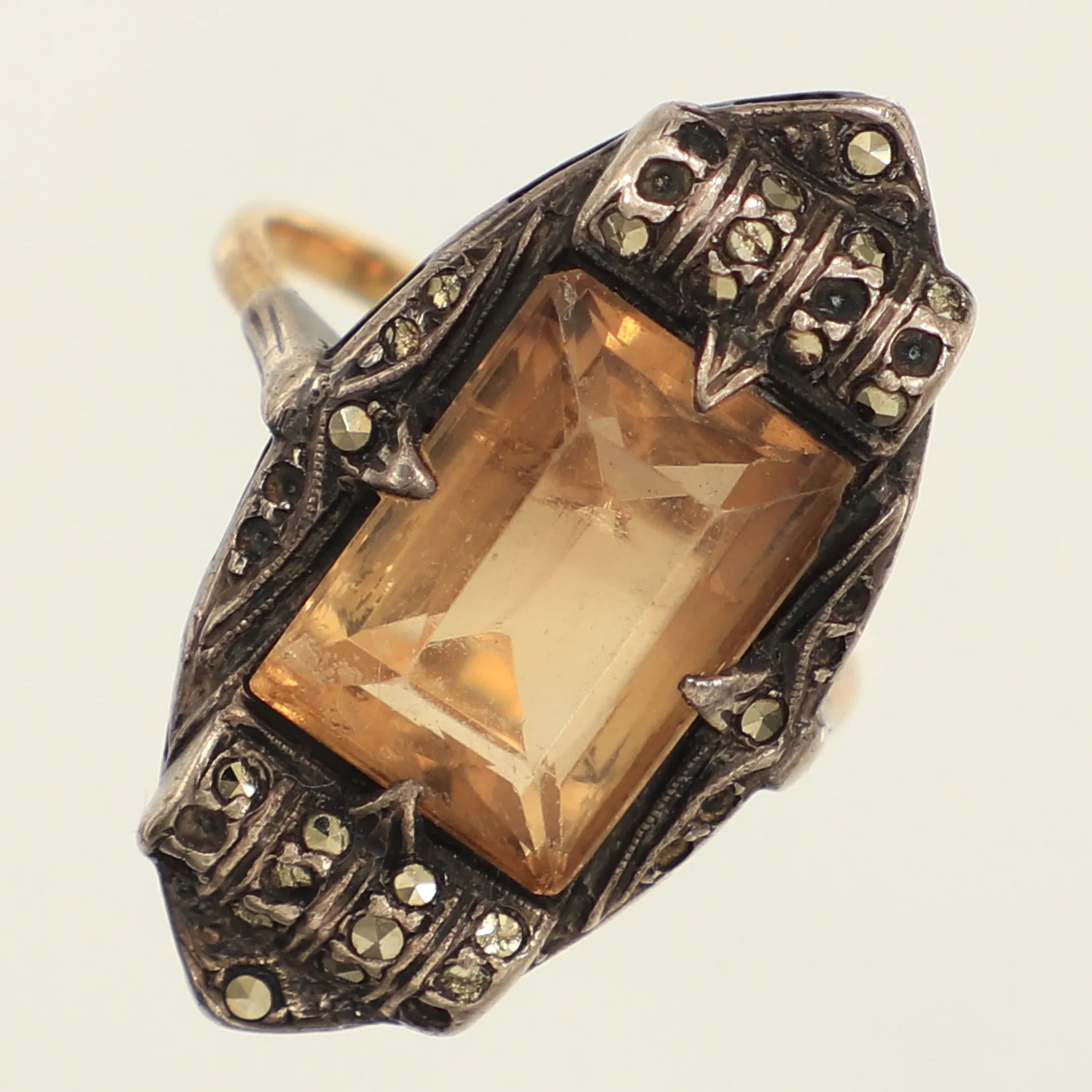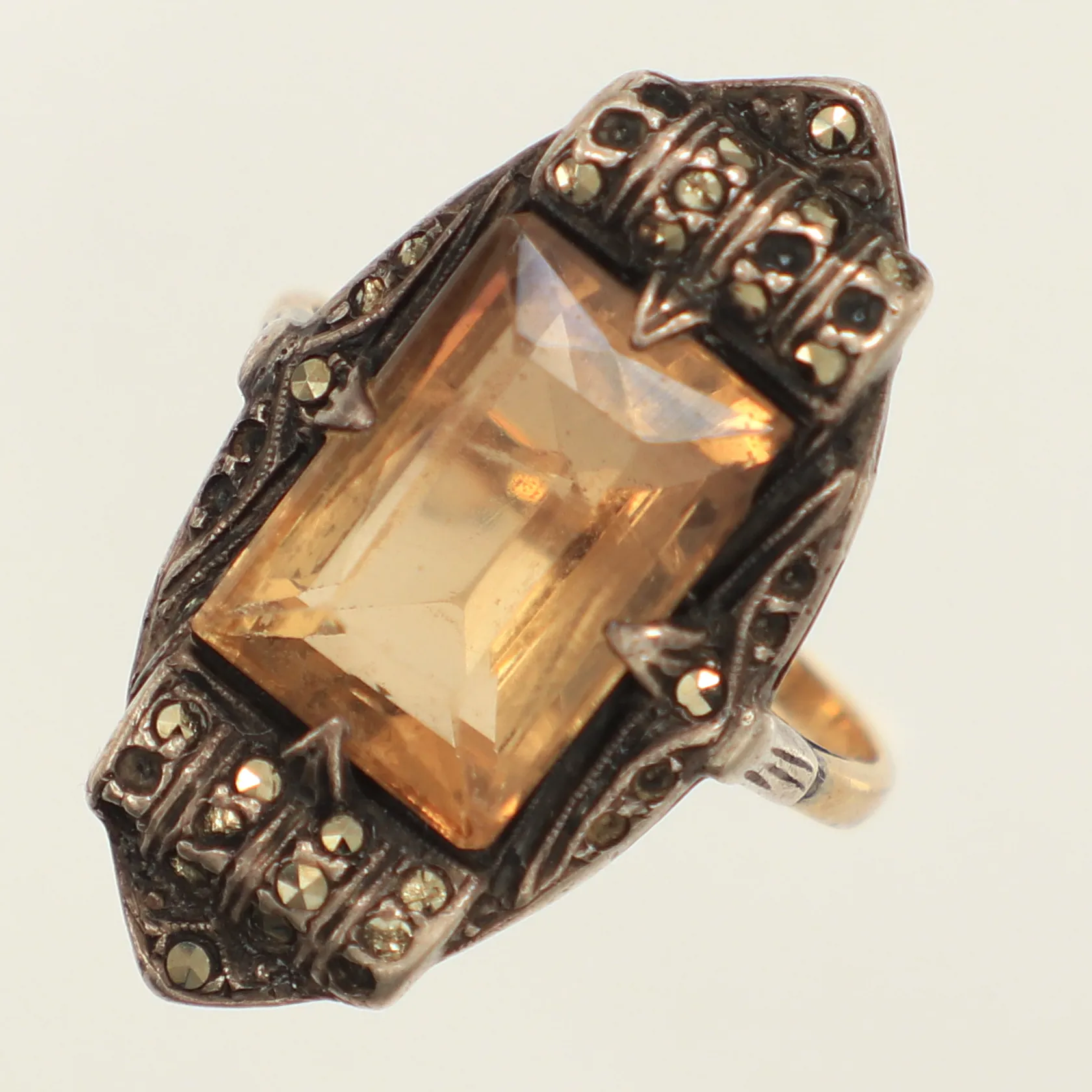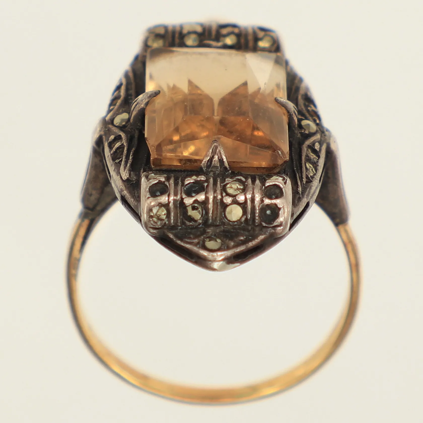 Ring gul glassten, markasiter, stl 17½, bredd 1,7-27,6mm, saknar stenar, infattning i silver, skena i 18K Bruttovikt: Vikt: 6,1 g.