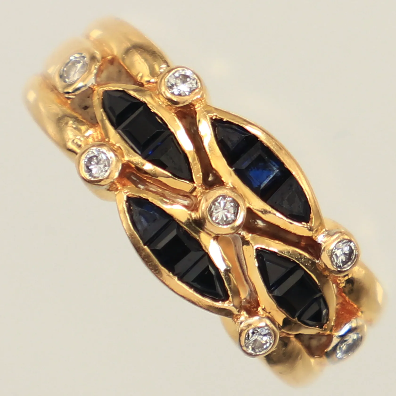 Ring, diamanter 7 x ca 0,002ct, safirer, stl 16½, bredd 8,5mm, gravyr, 18K Vikt: 5,6 g.