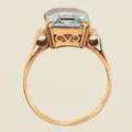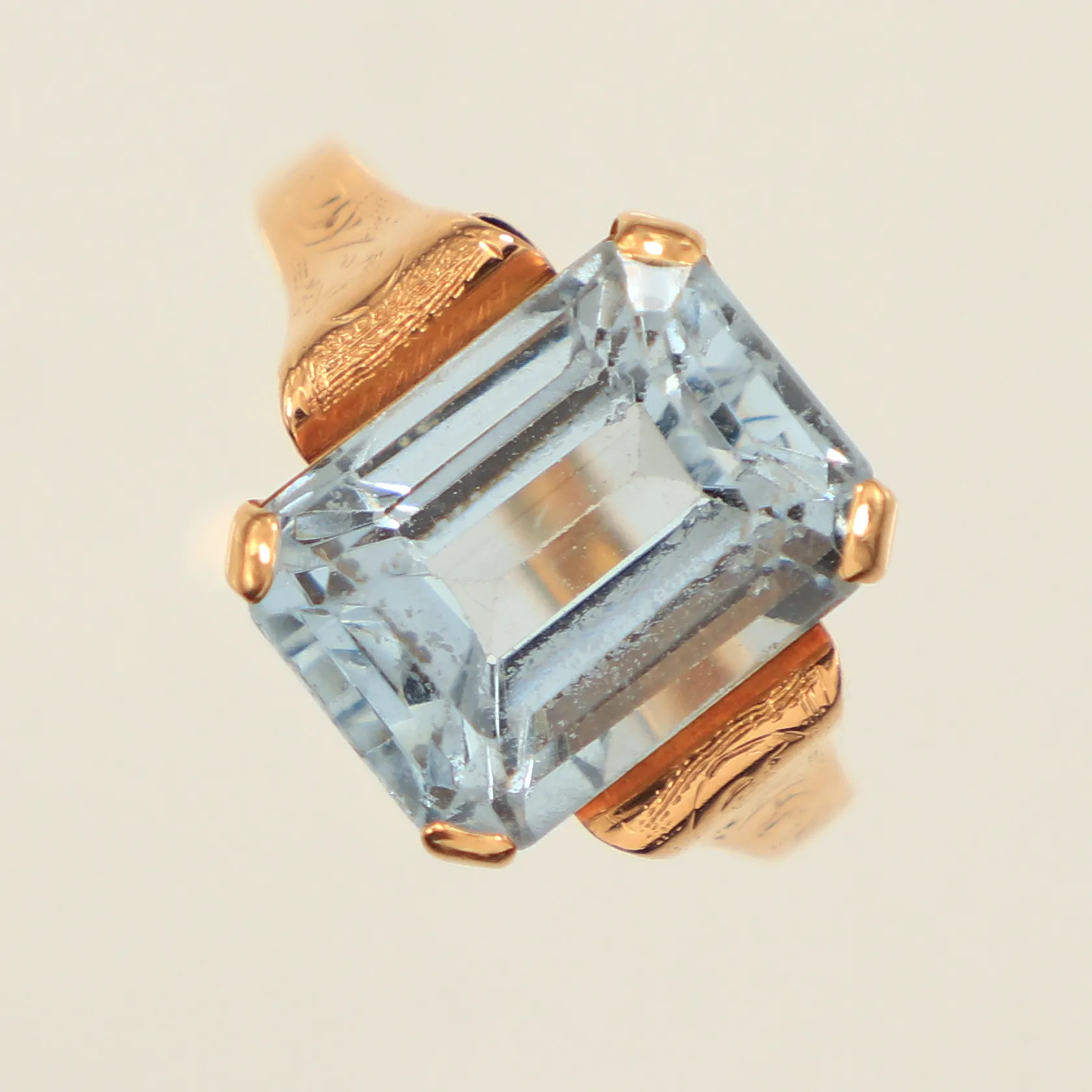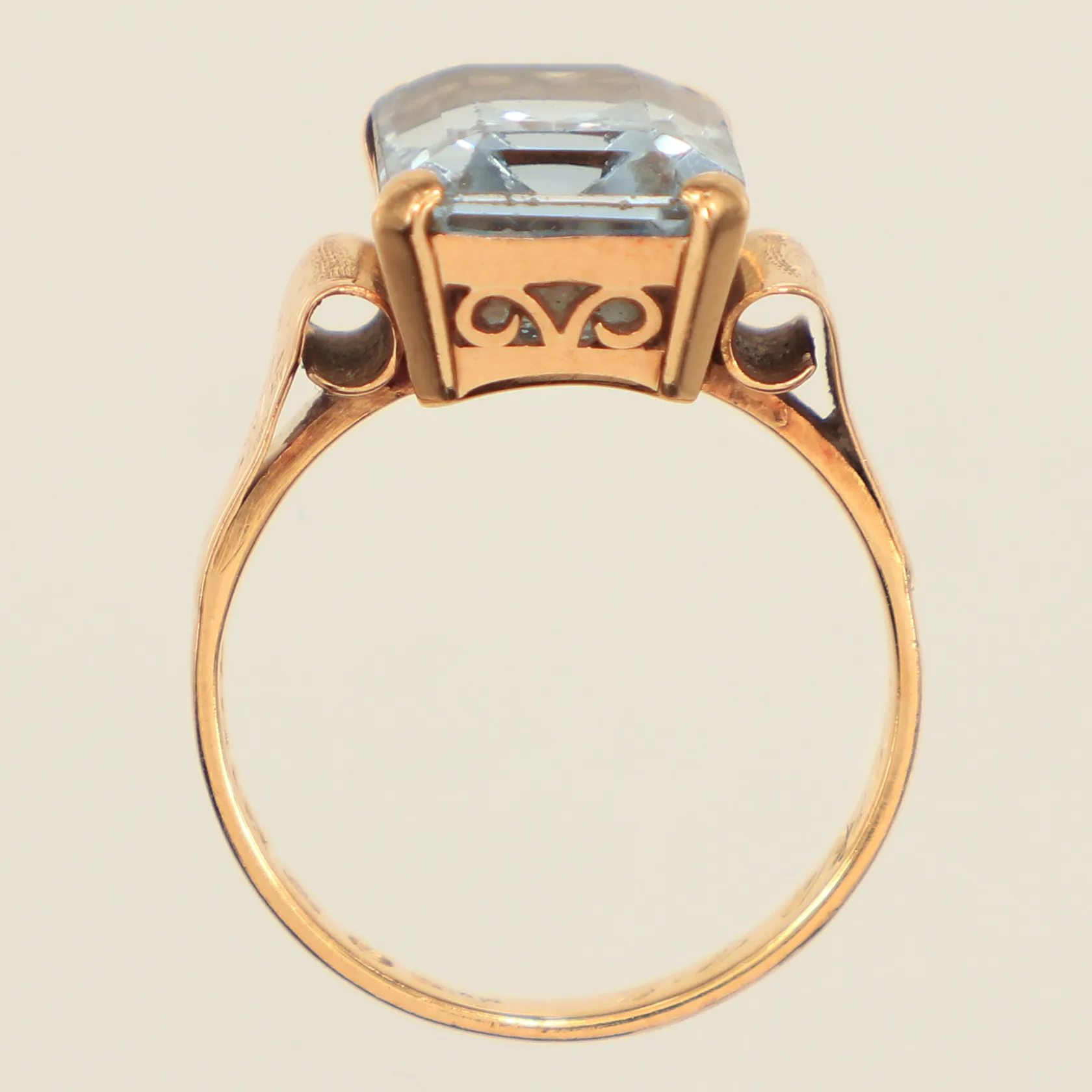Ring med blå sten, möjligen syntetisk spinell, stl 17, bredd 2,3-12,3mm, gravyr, 18K Vikt: 4,6 g.
