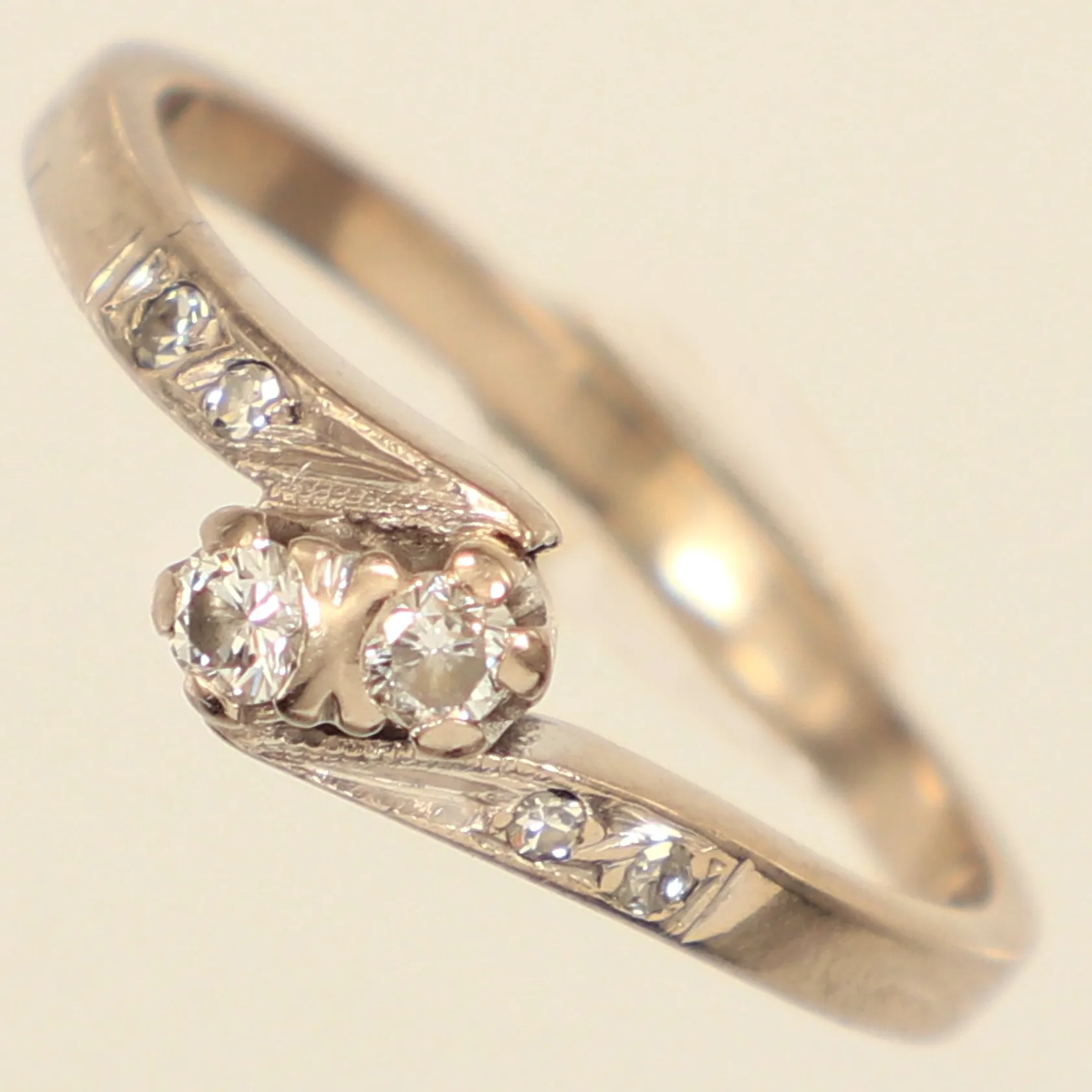 Ring med diamanter 2x ca 0,04ct, 4x ca 0,01ct, stl 18, bredd 1,8-5,5mm, vitguld, 18K Vikt: 3,4 g.