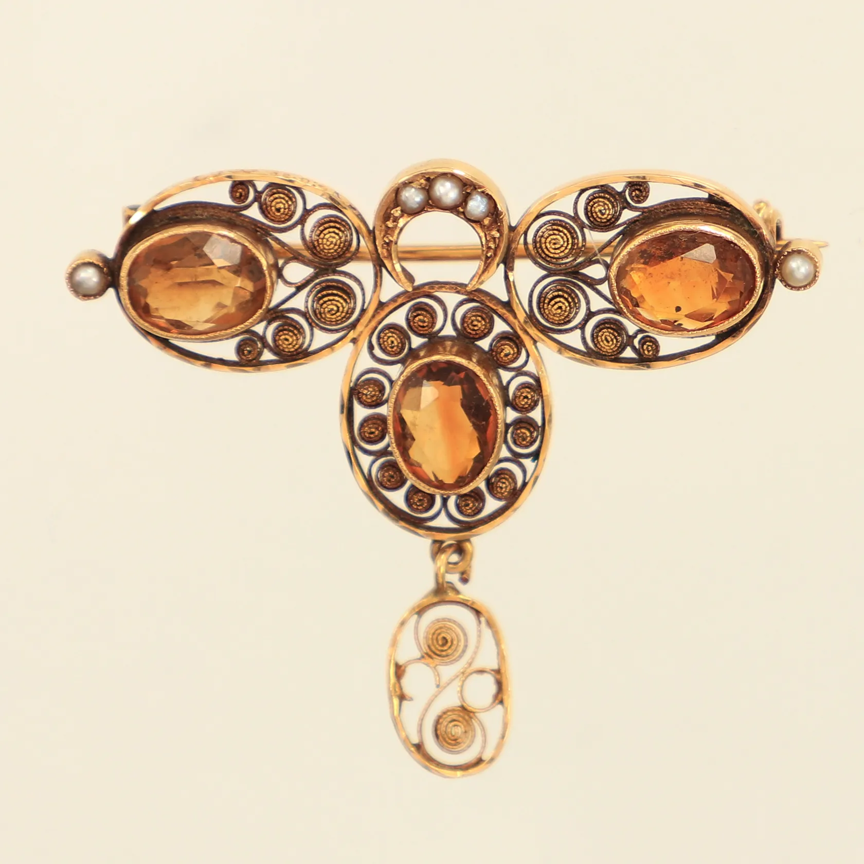 Brosch i filigranarbete med gul glasstenar samt pärlor, ca 30mm, bredd ca 10-37mm, 18K Vikt: 4,5 g.