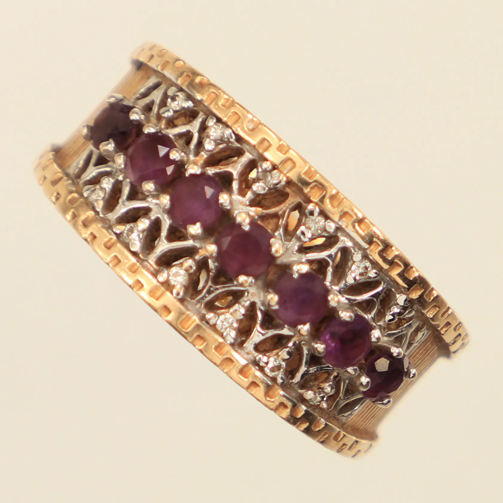 Ring med lila stenar och diamanter 12x ca 0,005ct, stl 20, bredd 6-11mm, tvåfärgad, 14K Vikt: 9,1 g.