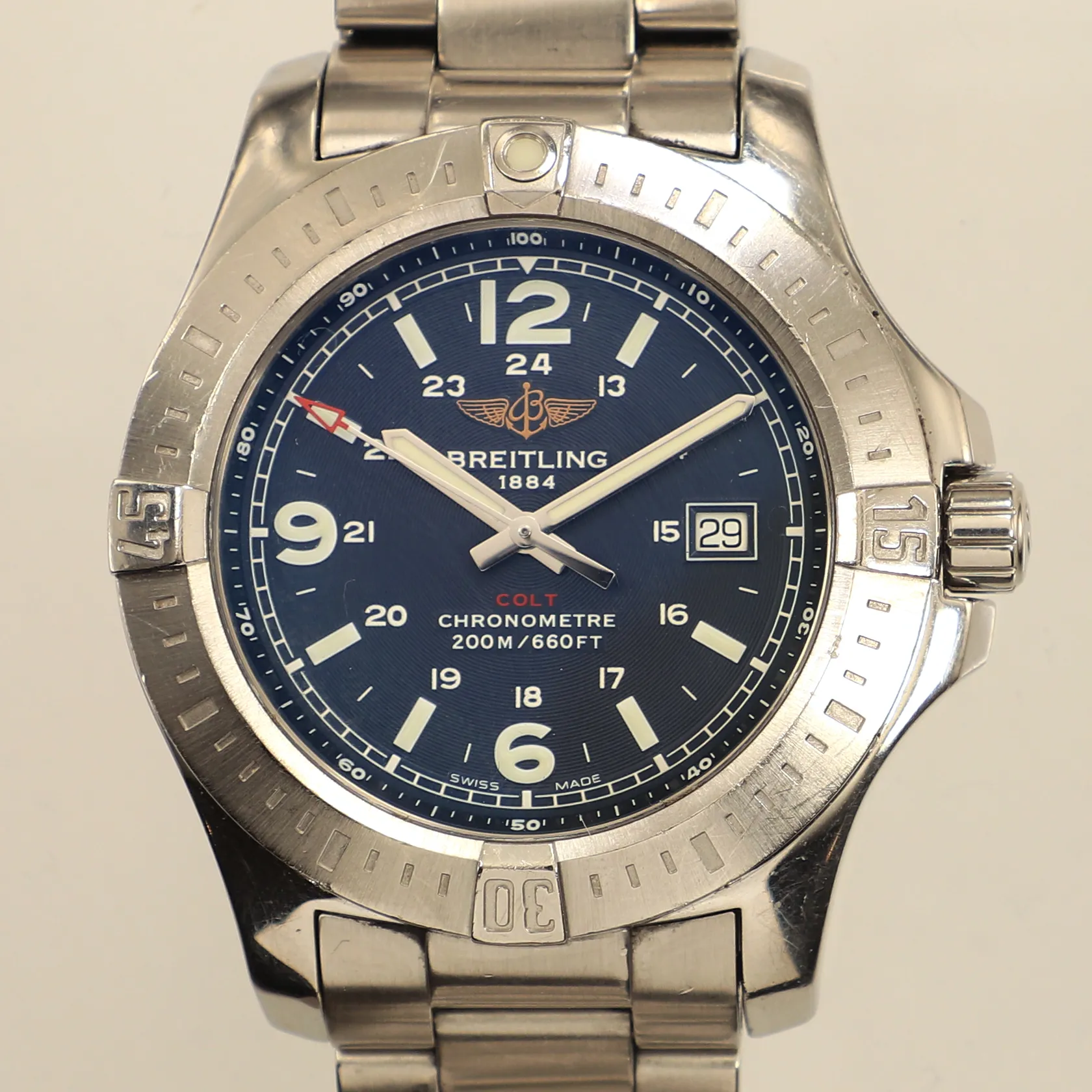 Armbandsur Breitling Colt, quartz, stål, Ø44mm, safirglas, datum, referensnummer A7438811/C907, serienummer 6155904, professional III länk, stål, viklås, längd 18cm, extra länkbitar, repor, manual, certifikat -2018, box, ytterkartong.