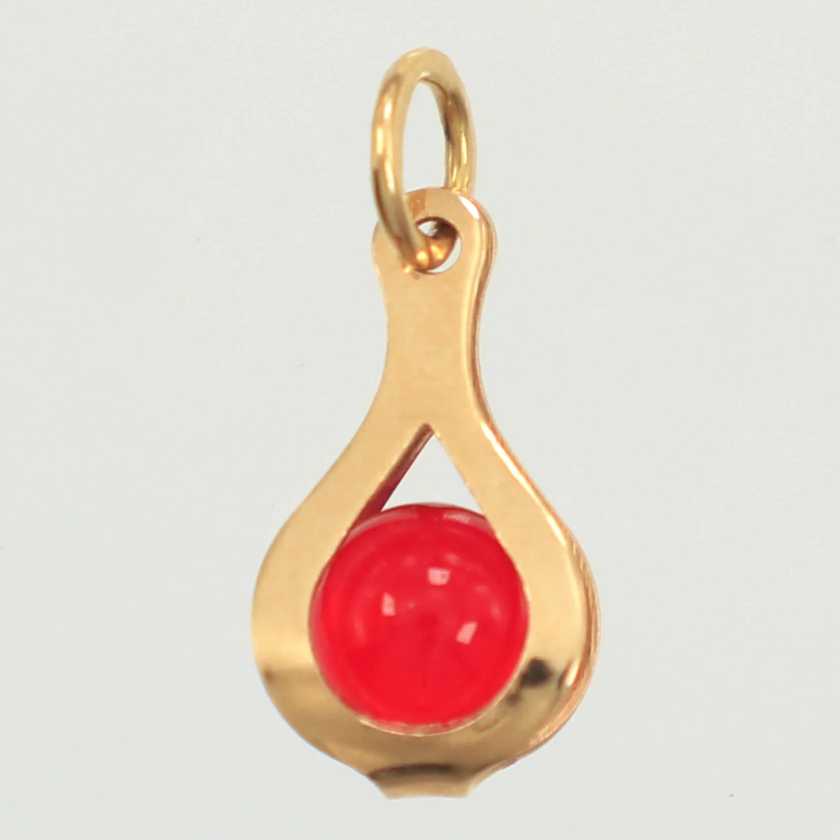 Hänge med röd sten, längd 15,8mm inklusive ögla, bredd 7mm, 18K Vikt: 0,6 g.