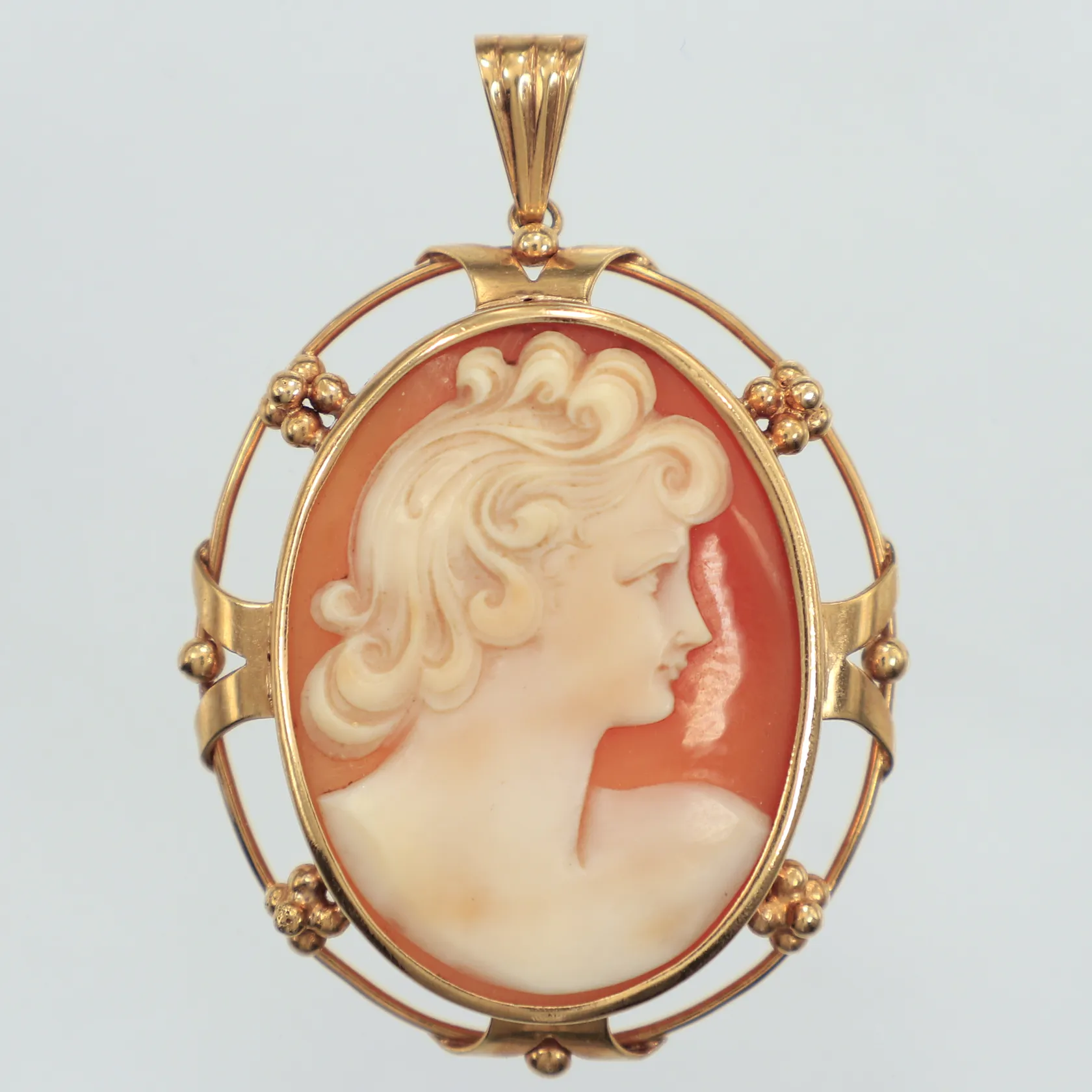 Hänge med Camé, längd 46mm inklusive ögla, bredd 32mm, år 1946, 18K Vikt: 9,3 g.