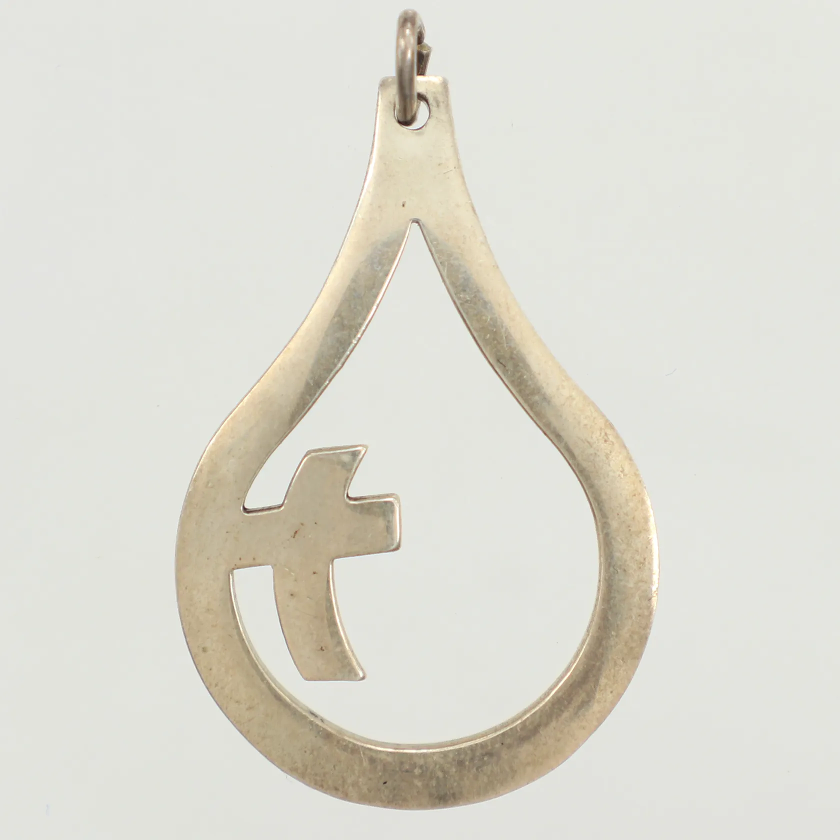 Hänge Dopdroppen, längd 35mm inklusive ögla, bredd 21mm, Sporrong, 925/1000 silver Vikt: 3,5 g.