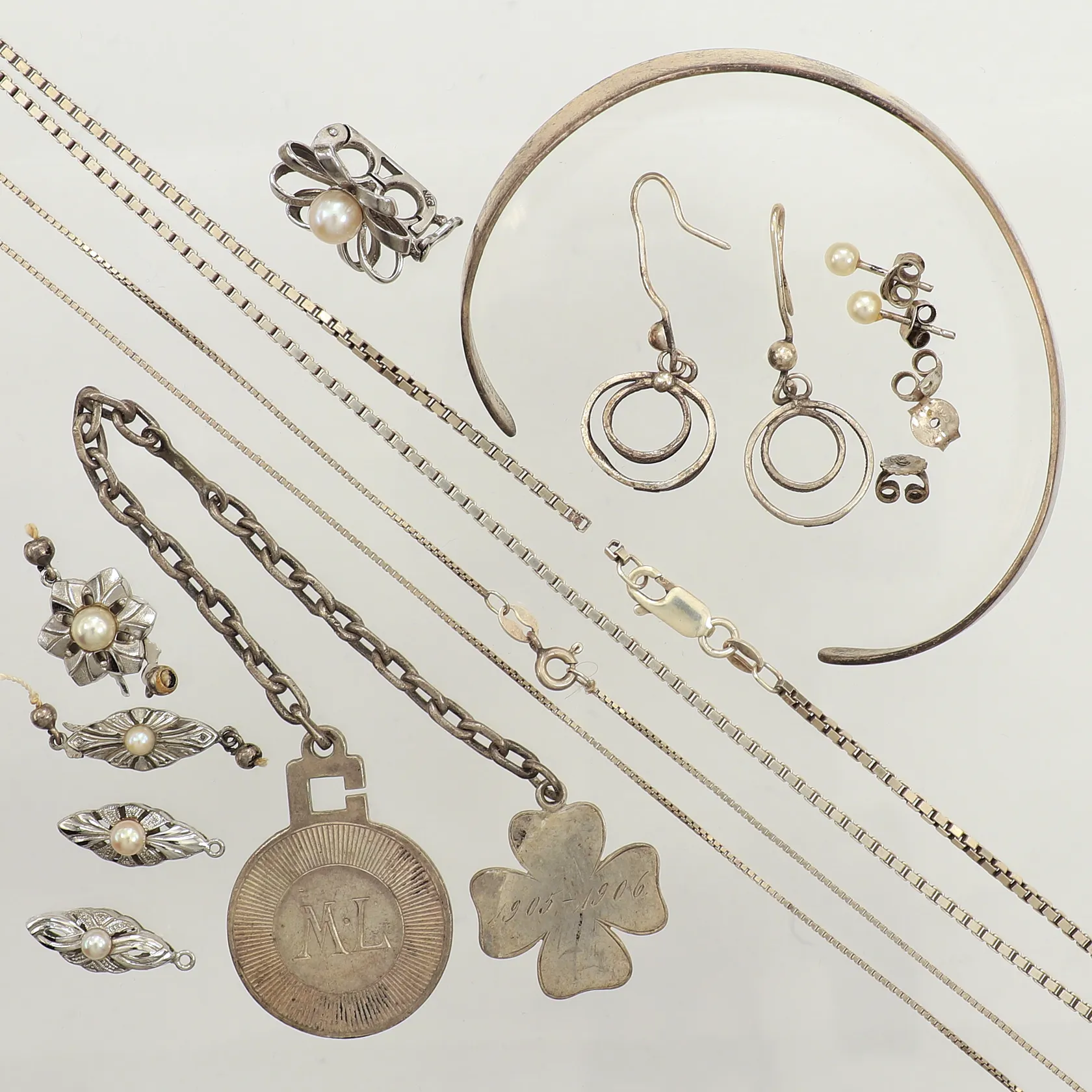 Diverse silver, defekt, gravyr, silver Vikt: 50,7 g.