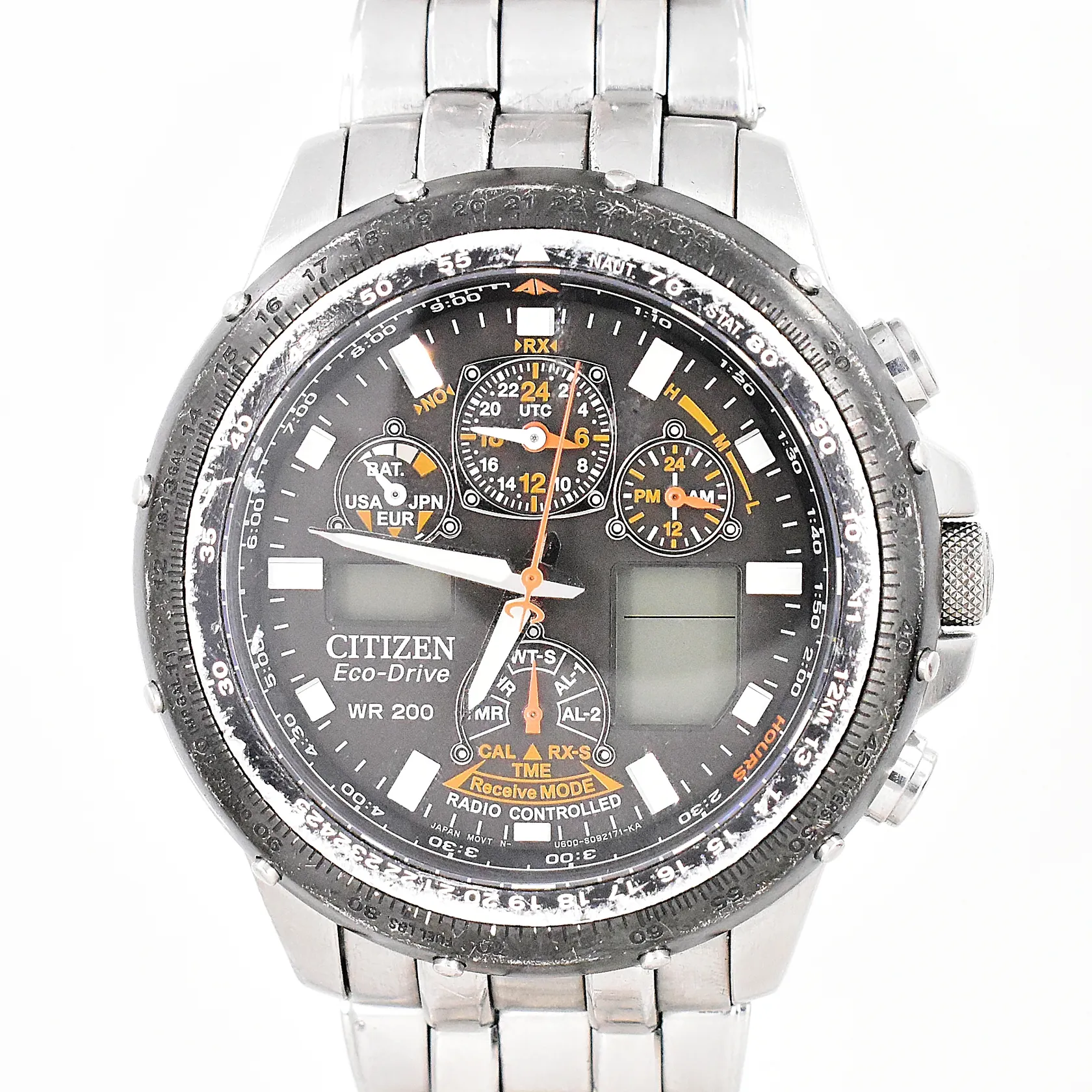 Herrur Citizen Promaster Eco-Drive WR200, 46mm, kronograf, digital, analog dag och datum, ej funktionstestad, behov av batteribyte, repig länk och bezelring, stållänk ca 20cm, inga tillbehör