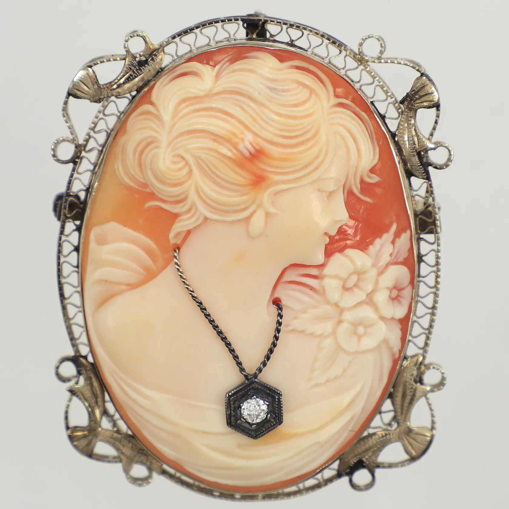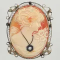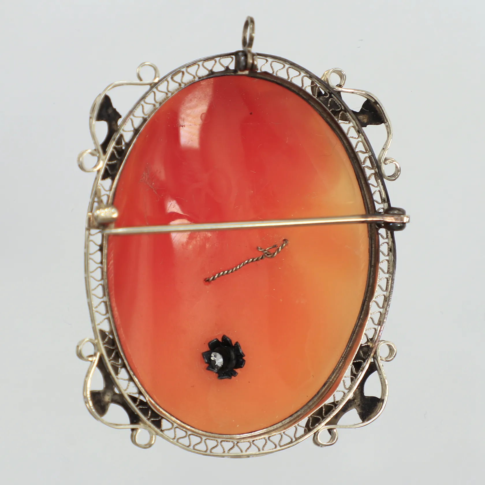 Brosch/ hänge med camé samt diamant ca 0,04ct, ca 48cm, inklusive ögla, bredd ca 35cm, felstämplat, metall Vikt: 11 g.