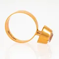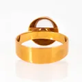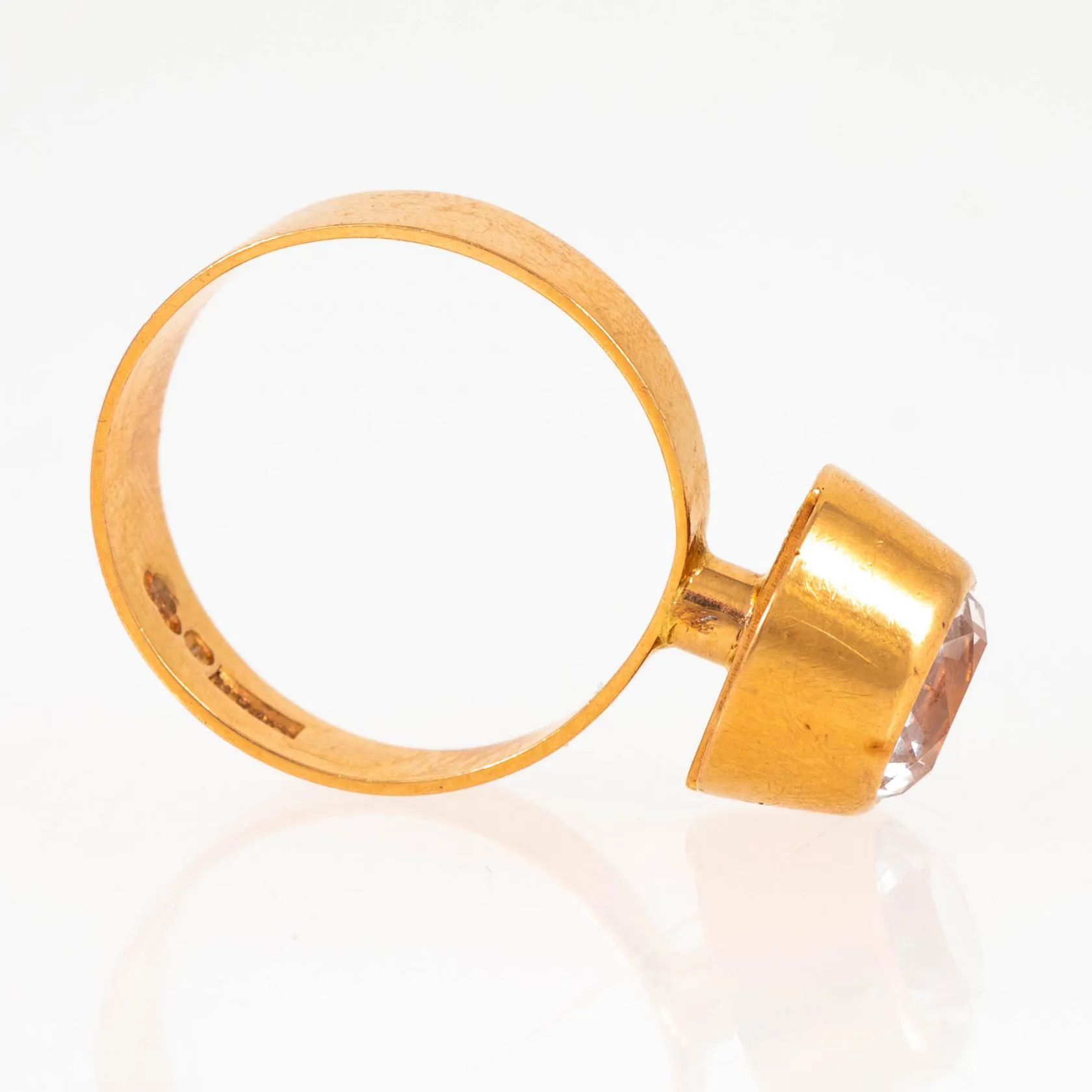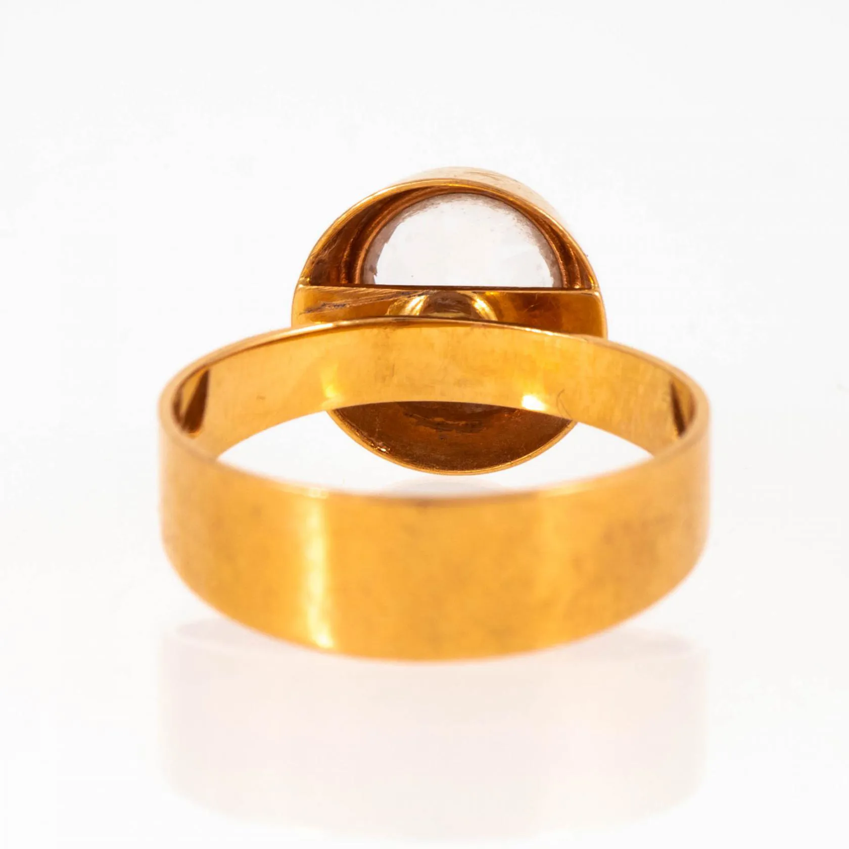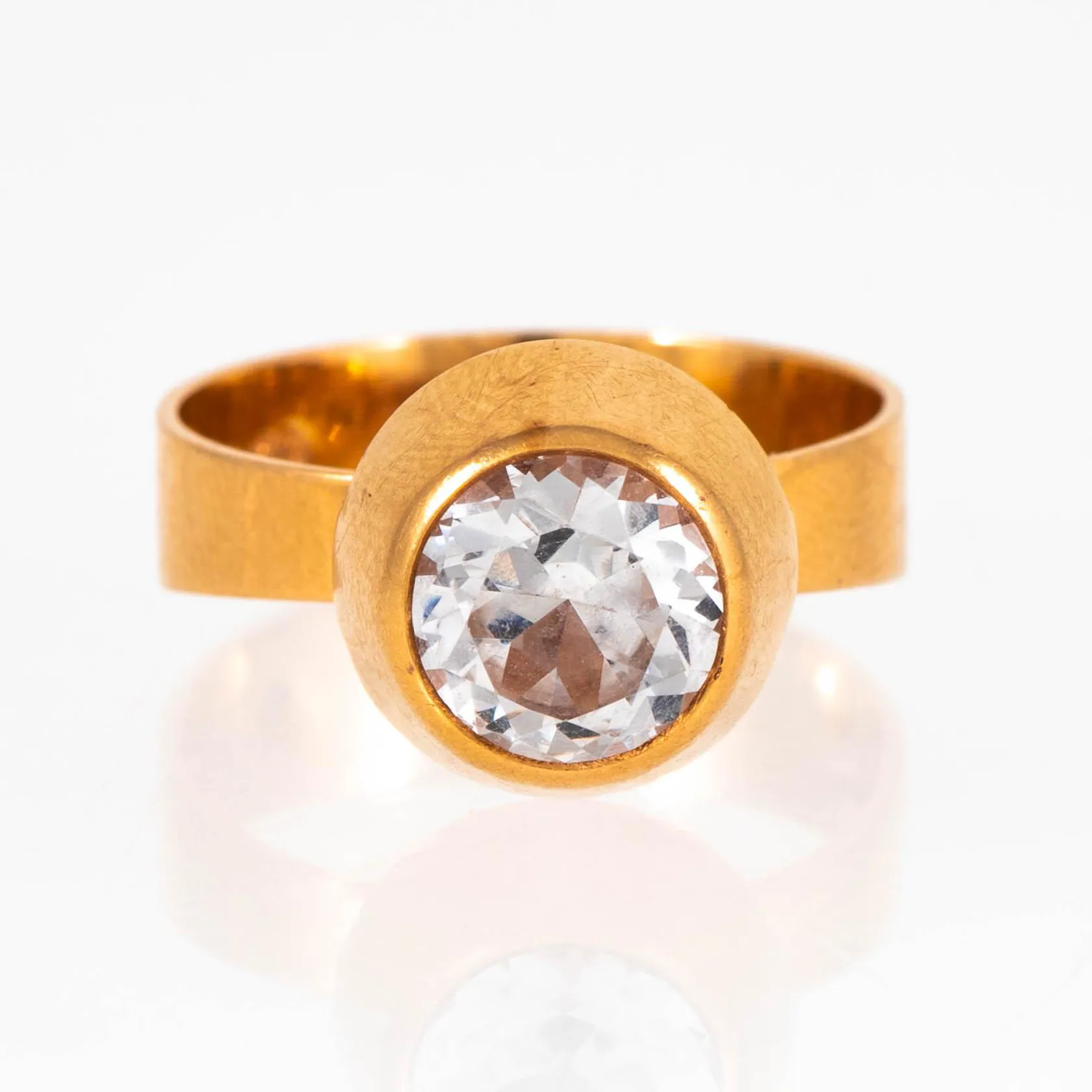 Ring i 18K guld med en vit sten i hög fattning. Den är 6 - 11,3 mm bred, är i storlek 17¾ och väger 4,2g. Stenen sticker upp 10 mm från fingret. Tillverkad 1969 av Styletta Guldvaruaktiebolaget i Stockholm. Kattfot. Vikt: 4,2 g.