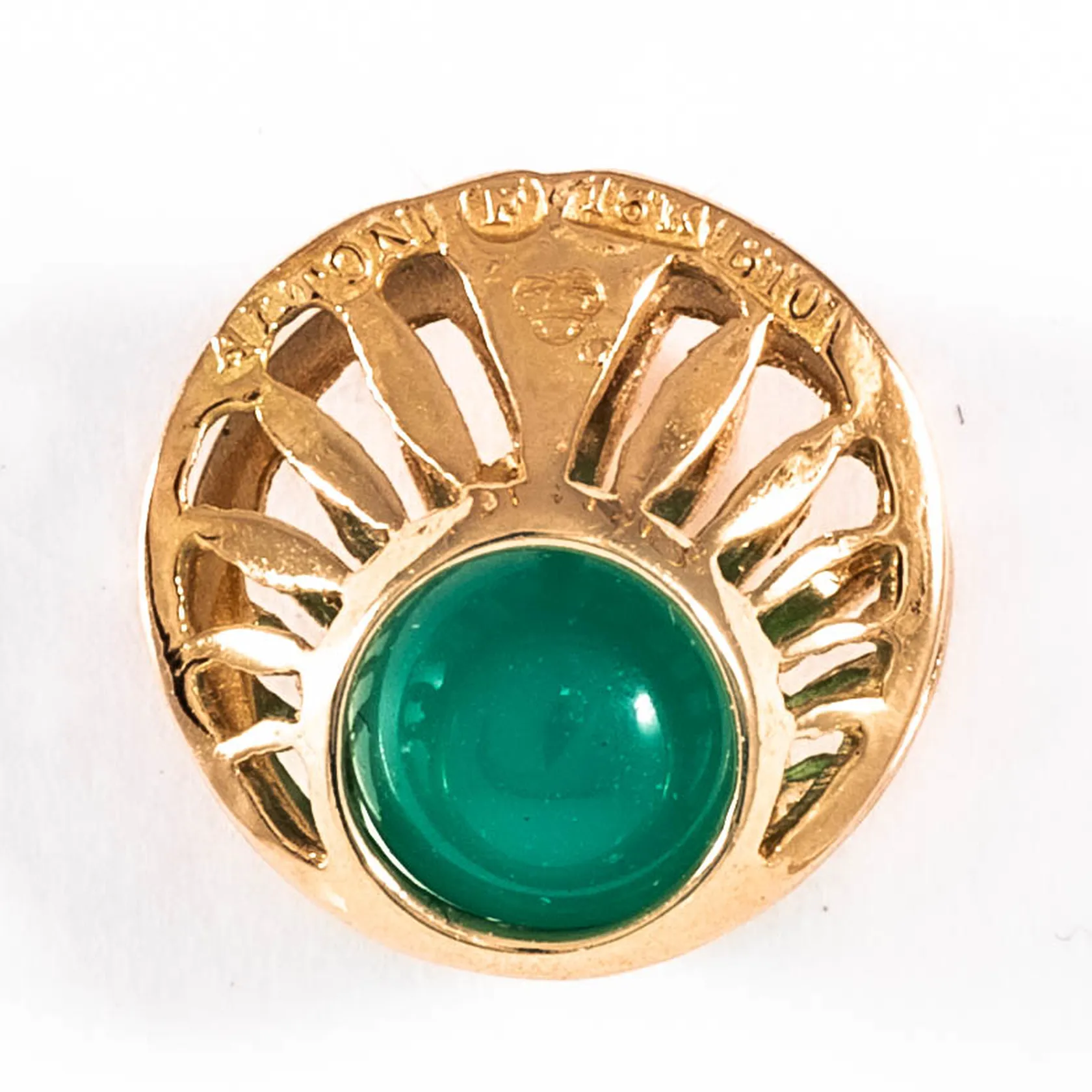 Hänge i 18K guld med grön sten "kula". Det är Ø 13 mm och väger 1,9g. Tillverkad 1976 av Alton Guldvaru AB i Falköping. Kattfot. Vikt: 1,9 g.