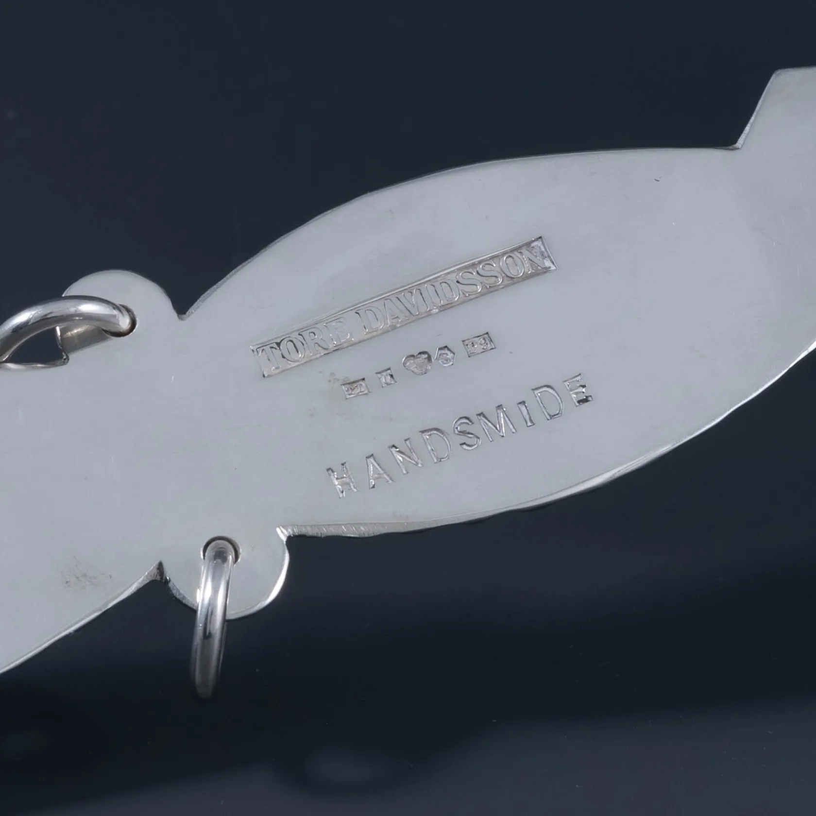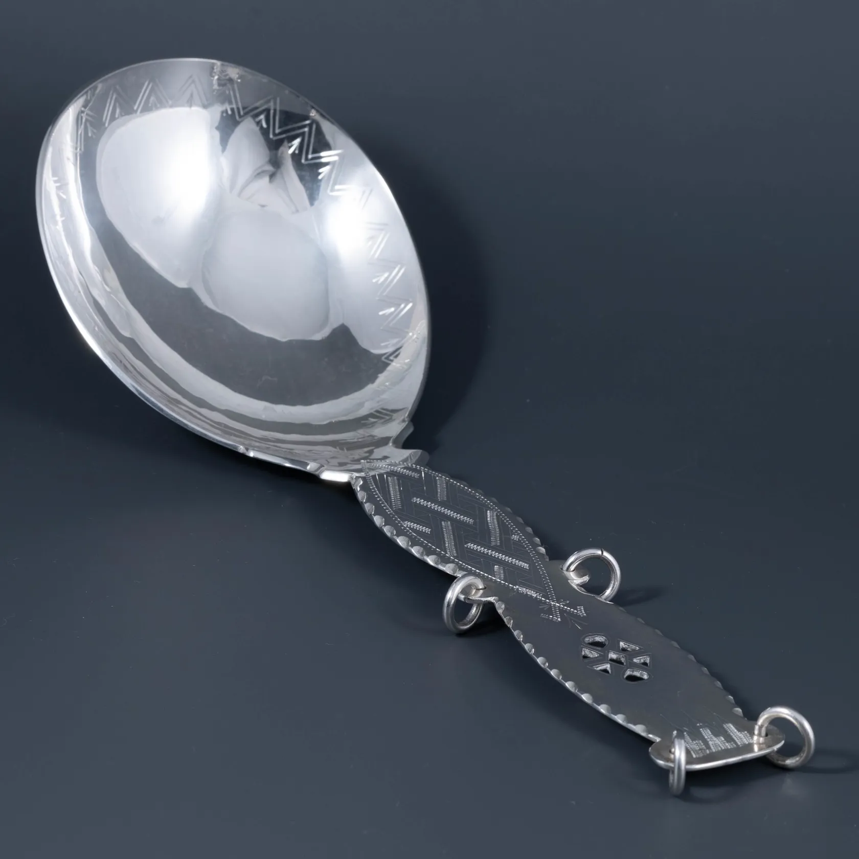 Stor sked i silver med handgraverad dekor. Längd 21,9 cm. Vikt 107,7g. Stämplad TORE DAVIDSSON HANDSMIDE, Vilhelmina. Tillverkad 1965. Vikt: 107,7 g.