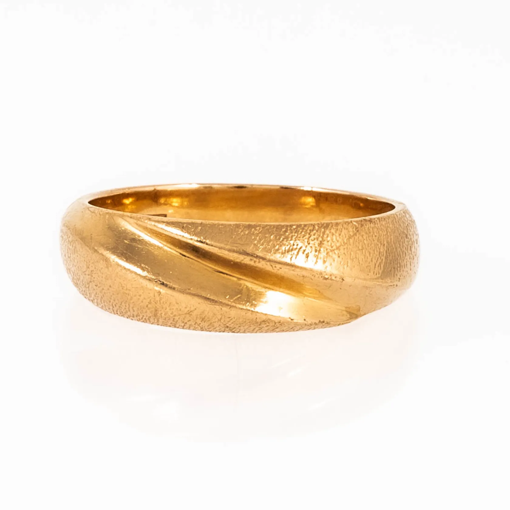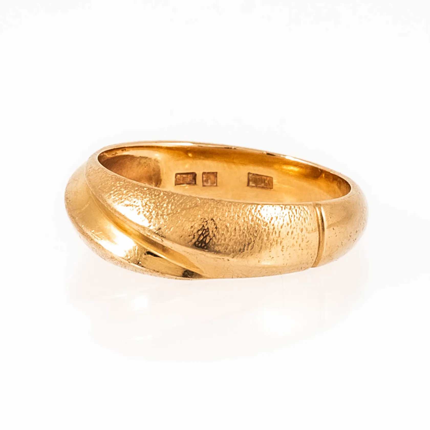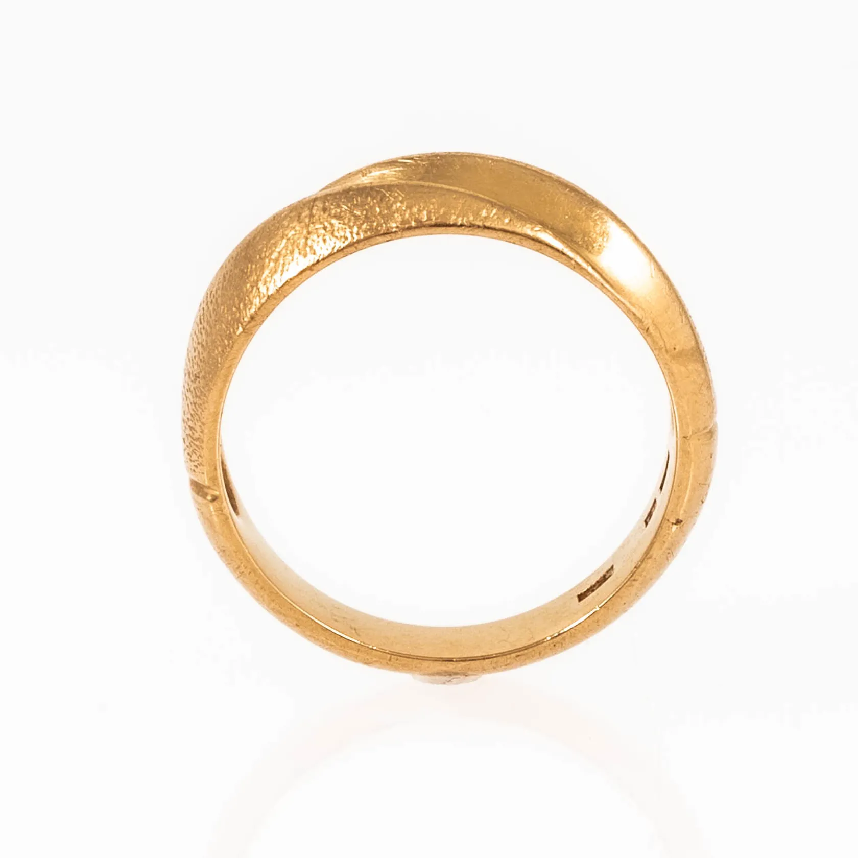Delvis mönstrad ring i 18K guld. Den är 4 - 6,6 mm bred, är i storlek 18 och väger 5,6g. Stämplad BEH (Bengt Hallberg Guldsmeds AB i Köping), 18K. Vikt: 5,6 g.
