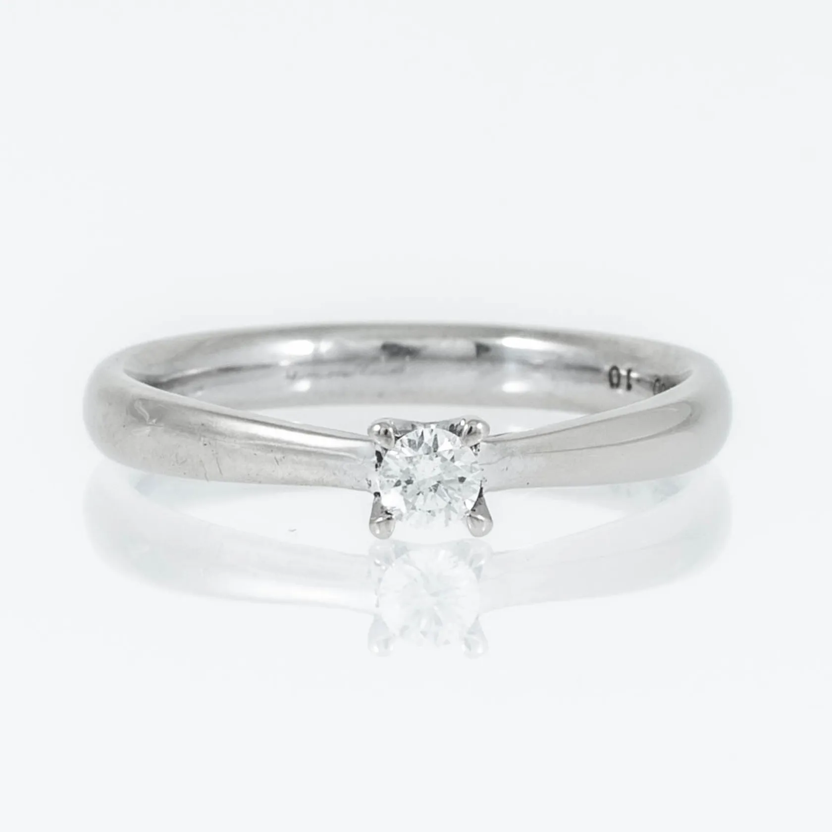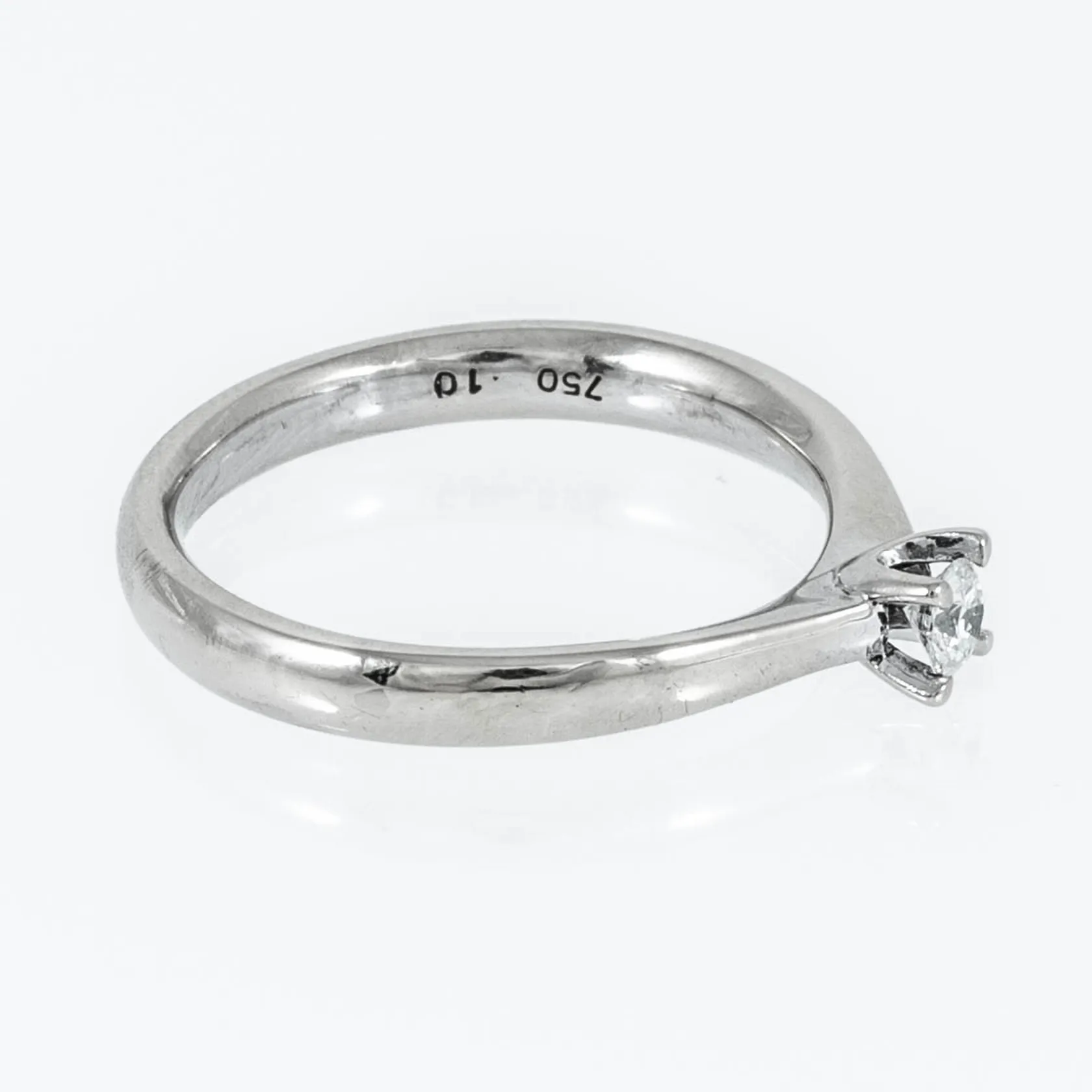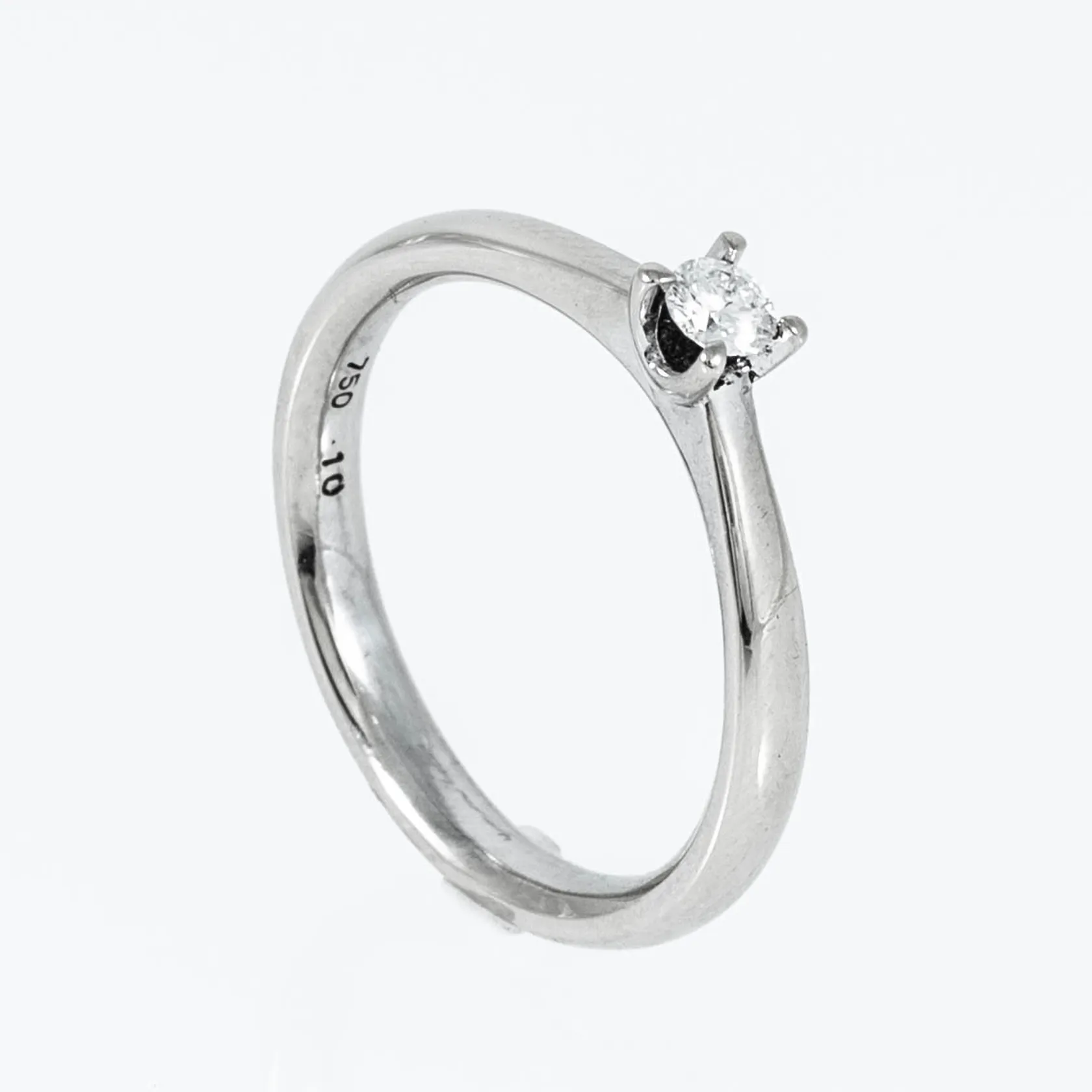 Ring i 18K vitguld med 1 x 0,10ct briljantslipad diamant i fyrklofattning. Den är 2,7 - 3,7 mm bred, är i storlek 16¾ och väger 3,4g. Stämplad GHA (Guldfynd/Hallbergs), 750 & Stenvikt 0,10ct. Vikt: 3,4 g.