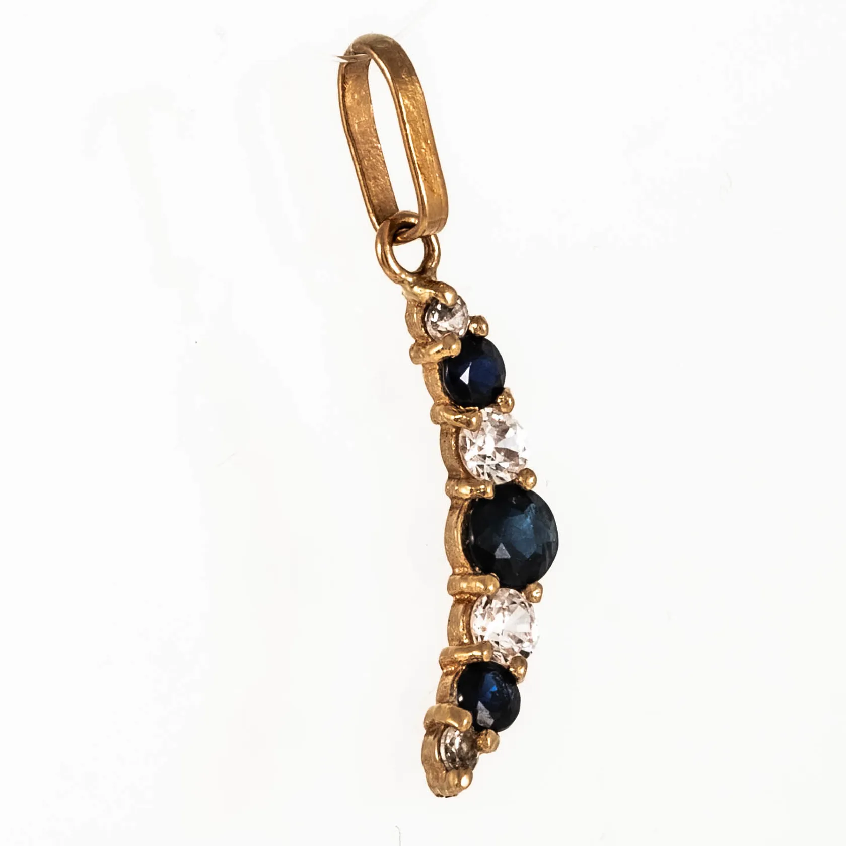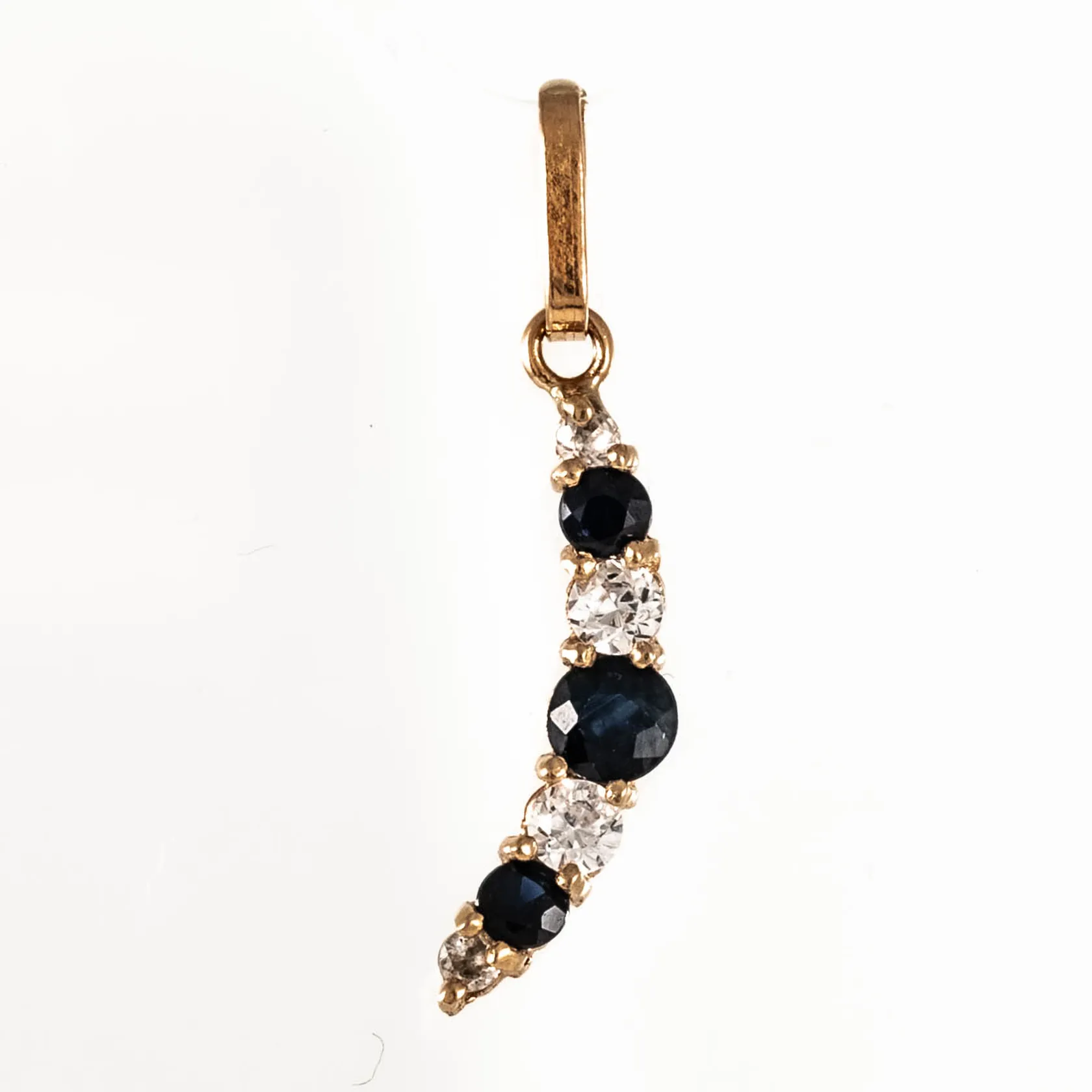 Berlock i 18K guld med vita & mörkblå stenar. Den är 24,2 mm lång inkl. ögla och väger 0,7g. Stämplad 18ct. Vikt: 0,7 g.