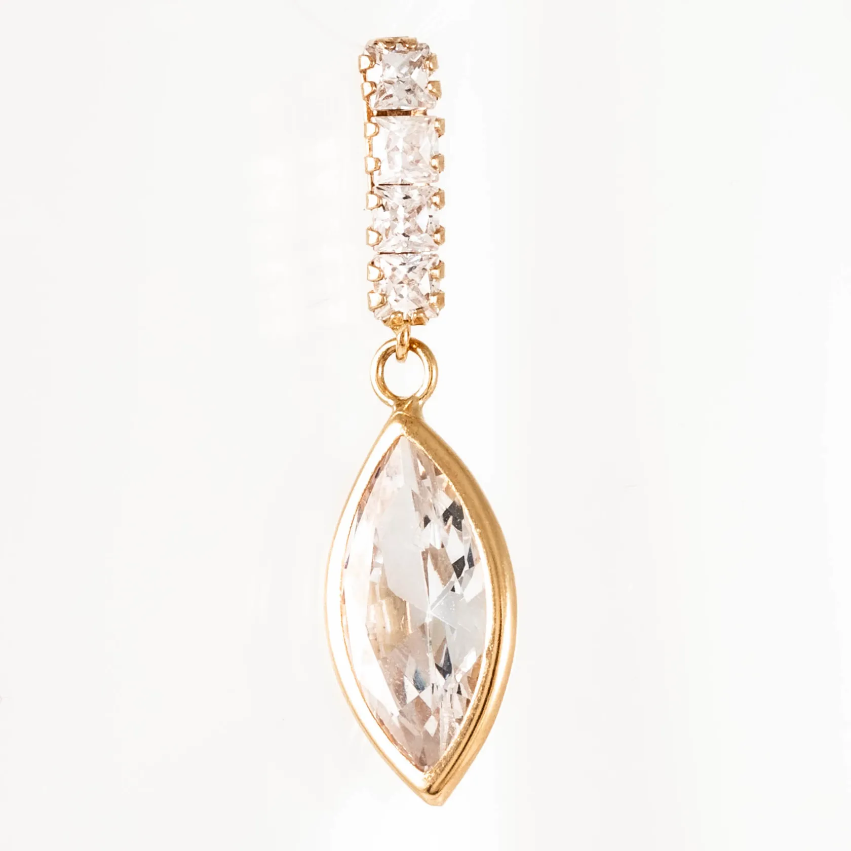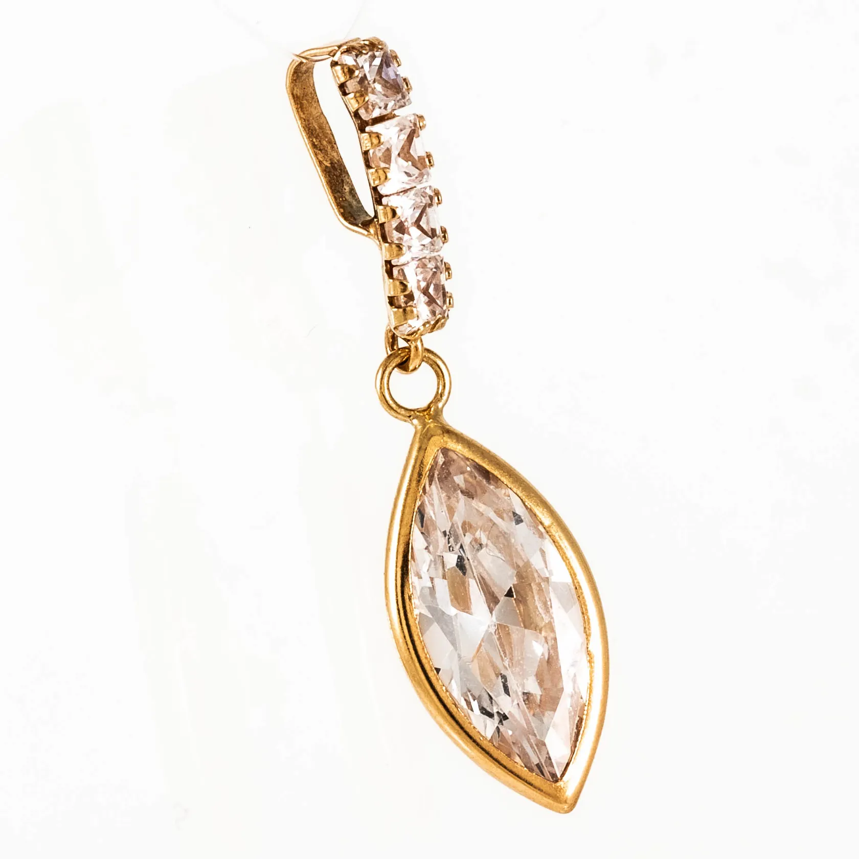 Berlock i 18K guld med vita stenar. Den är 28,8 mm lång inkl. ögla och väger 1,4g. Stämplad GHA 750. Vikt: 1,4 g.