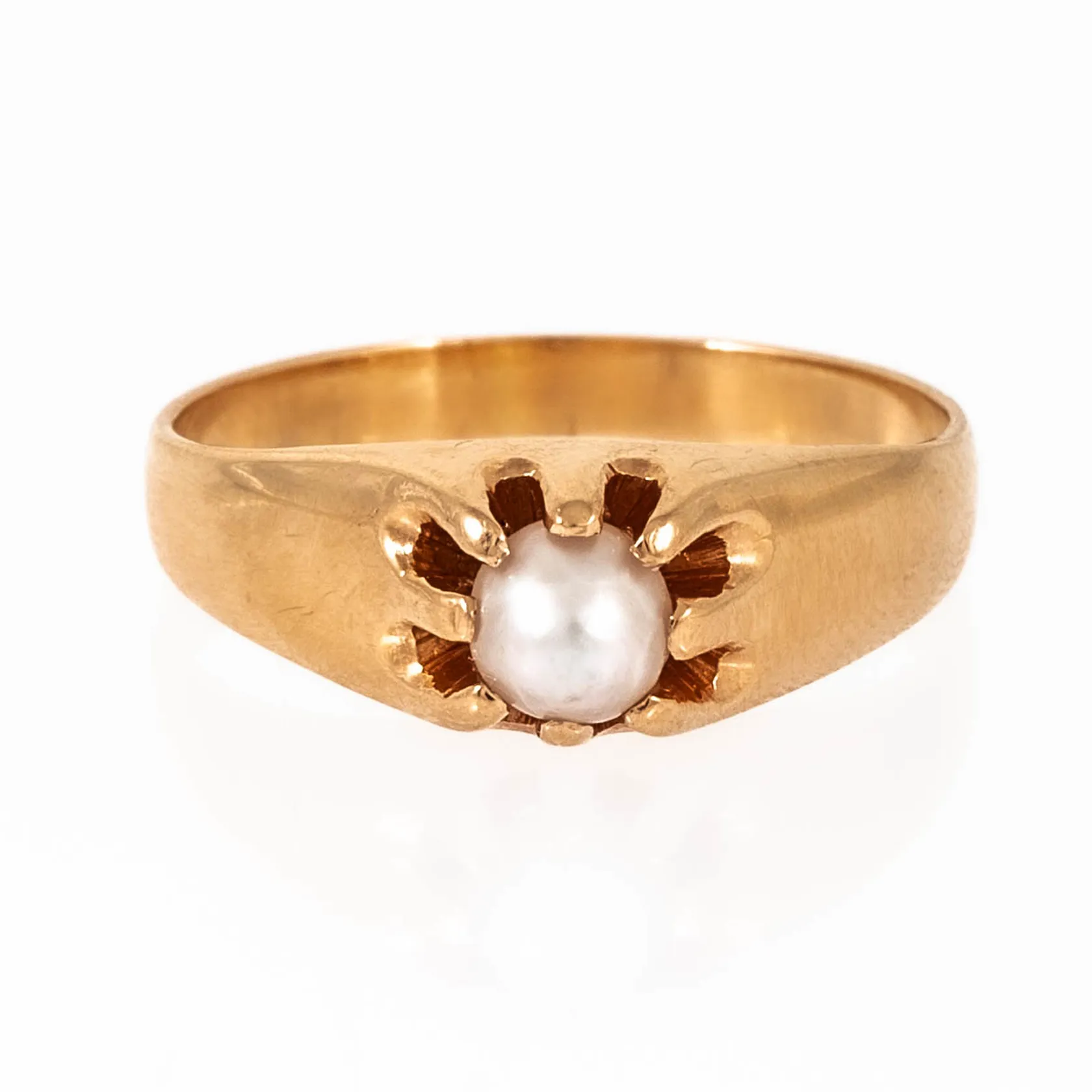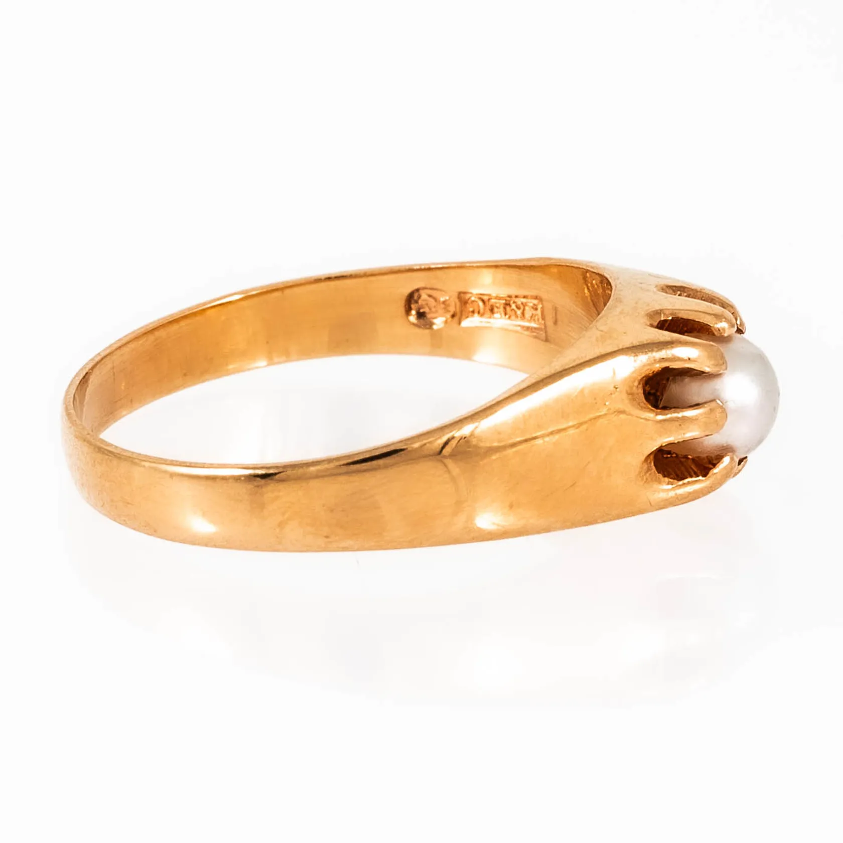Ring i 18K guld med odlad pärla Ø 4,5 mm. Den är 2,5 - 6,5 mm bred, är i storlek 17¾ och väger 4,1g. K&EC, M9 (1962), 18K & Kattfot. Vikt: 4,1 g.
