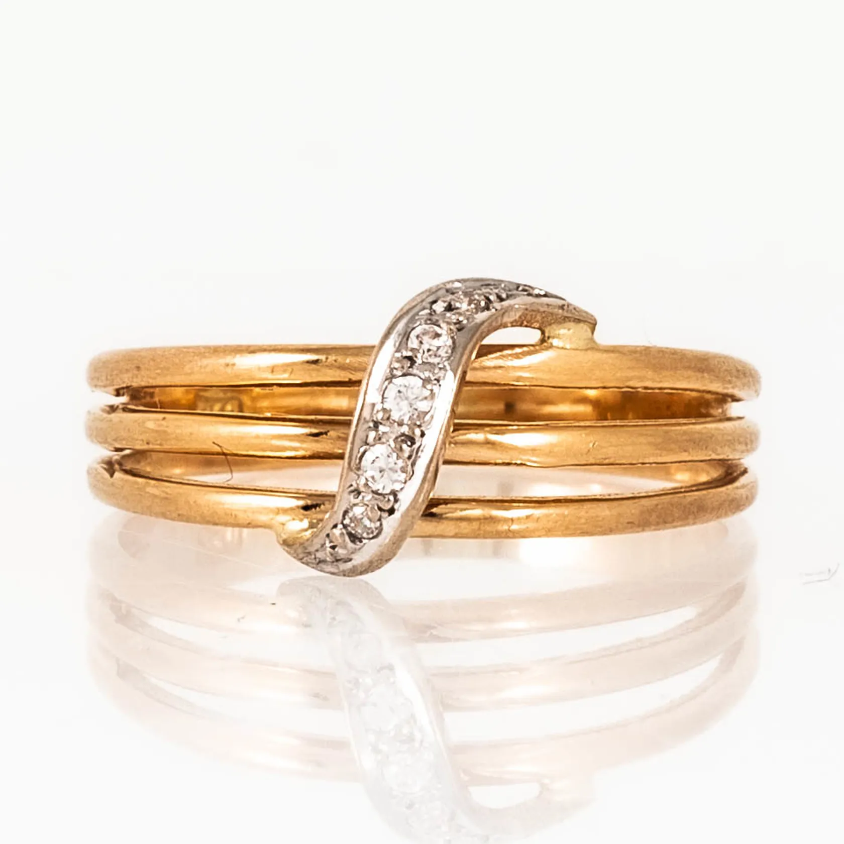 Doserad ring i 18K guld. Dekorslinga i vitguld med fem vita stenar. Den är i storlek 17½, är 3 - 8,5 mm bred och väger 2,8g. Stämplad 750. Vikt: 2,8 g.