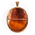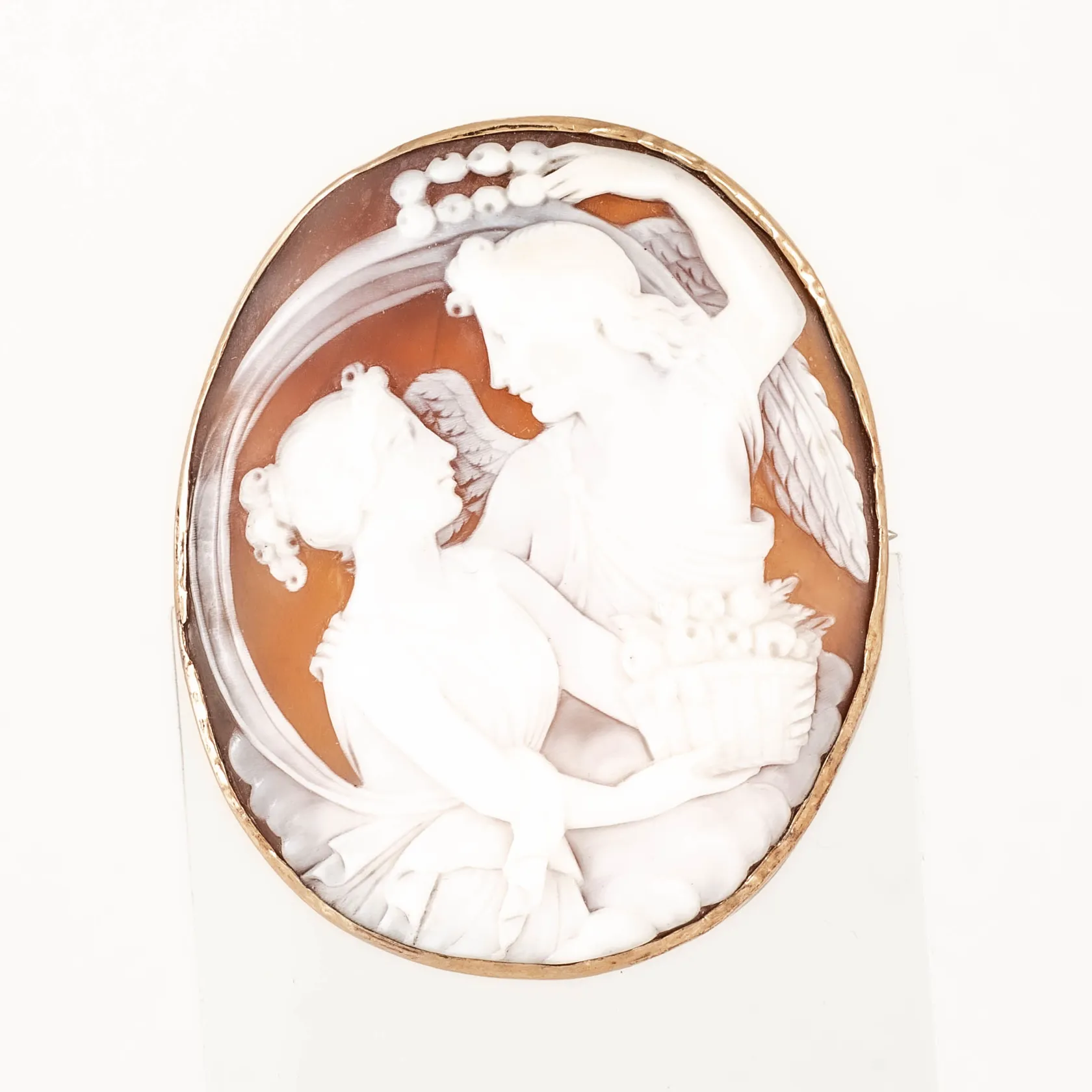 Brosch / hänge med vackert snidad camé i 18K guld. Den är 51 x 42,5 mm exkl. infällbar ögla och väger 12,1g bto. Metallnål. Vikt: 12,1 g.