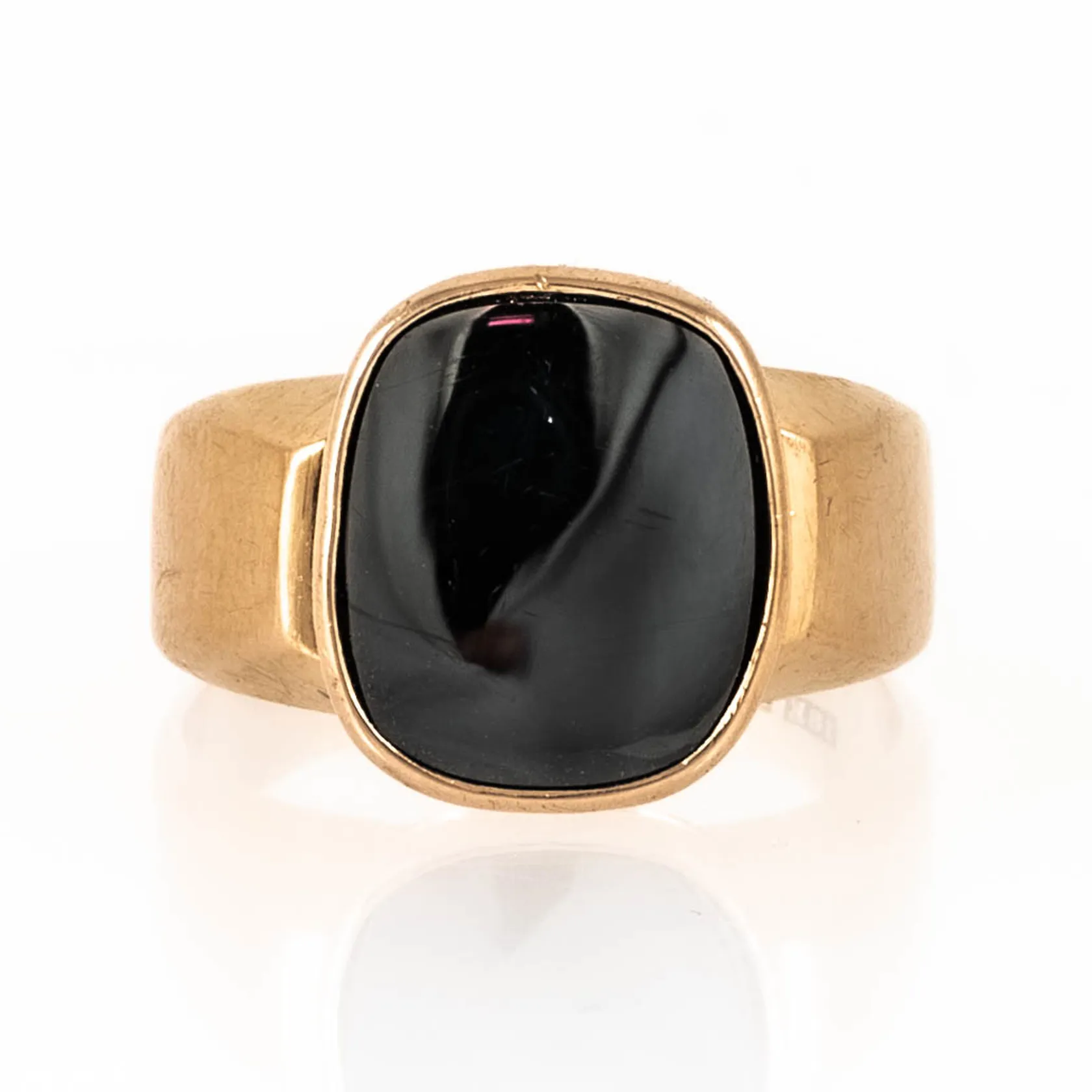 Klackring i 18K guld med hematit. Den är i storlek 19¾, är 4 - 14,8 mm bred och väger 6,7g. Tillverkad 1963 av Ceson i Göteborg. Stämplad 18K & kattfot. Vikt: 6,7 g.