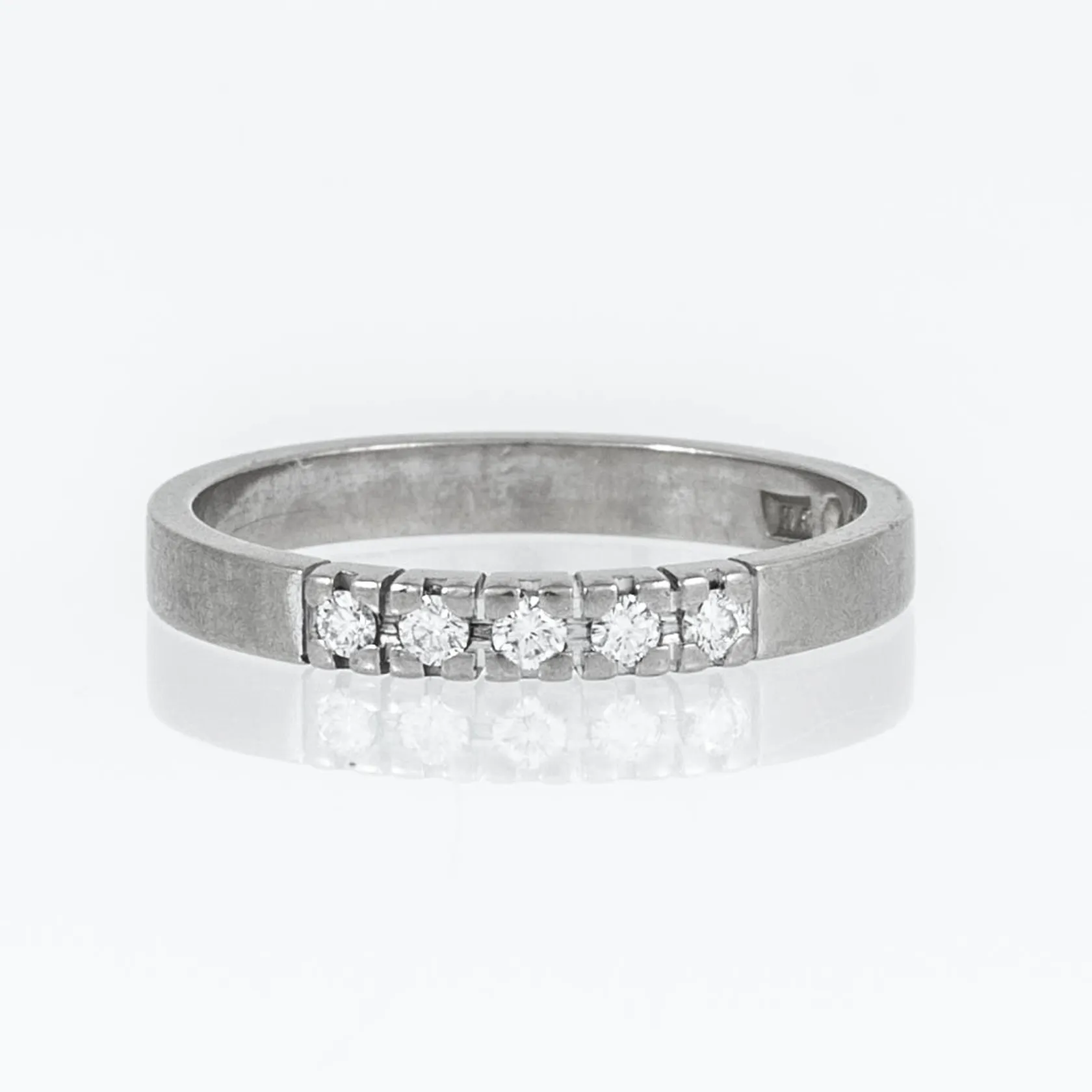 Stjärnring "Fenix" i 18K vitt guld med 5 briljantslipade diamanter á 0,02ct Tw/si. Den är i storlek 17, är 2,5 mm bred och väger 2,9g. Stenstorlek 0,20ct ingraverad. Stämplad Stjärnringen stjärna, F10 (1980), HS (Hans Strömdahl, Stockholm), 18K & kattfot. Vikt: 2,9 g.