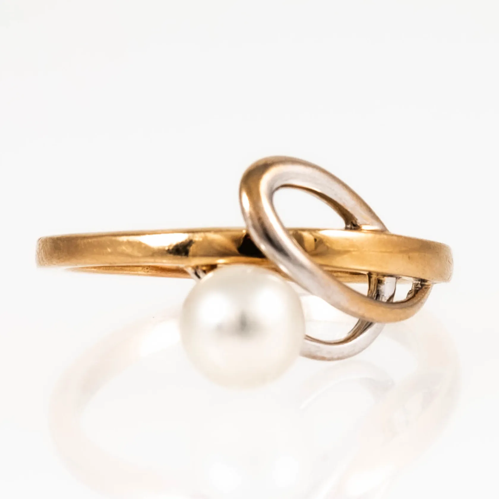 Ring i 18K guld med en odlad vit pärla Ø 6,5 mm och vitguldsslinga. Den är i storlek 18½, är 2 - 12 mm bred och väger 4,8g. Stämplad 750 & en logotyp "två spegelvända G:n i hjärtform". Vikt: 4,8 g.