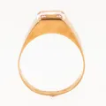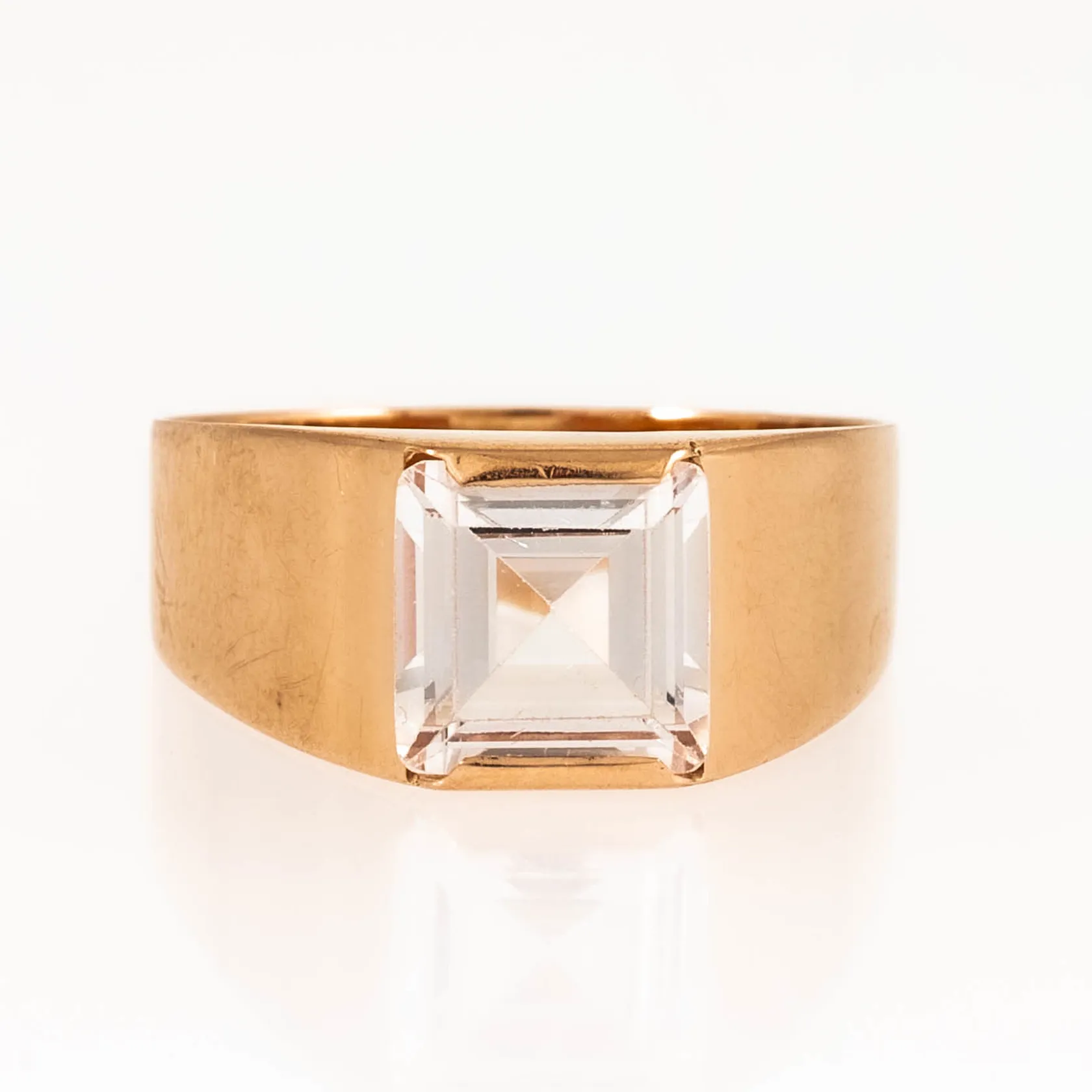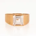 Doserad ring i 18K guld med vit sten 8 x 8 mm. Den är i storlek 19, är 4 - 9 mm bred och väger 3,9g. Tillverkad 1965 av Alton i Falköping. Kattfot. Vikt: 3,9 g.