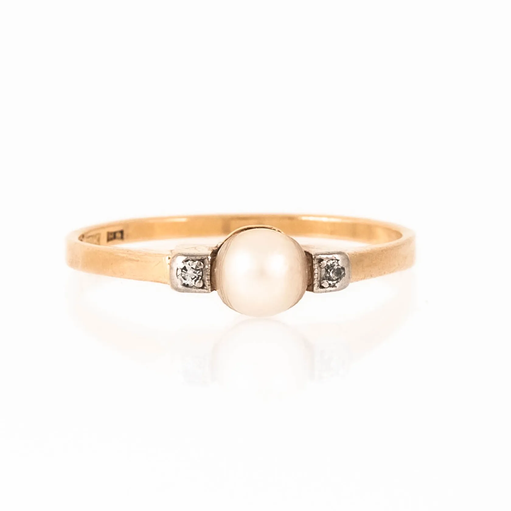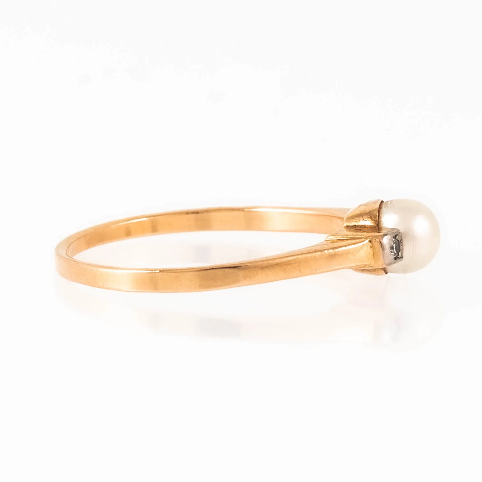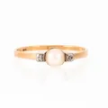 Ring i 18K guld med odlad vit pärla Ø 5 mm och 2 x ca 0,005ct åttkantslipade diamanter; fattade i vitt guld. Den är i storlek 18½, är 1,3 - 5 mm bred och väger 2,3g. Stämplad 18K, kattfot & H9 (1958). Vikt: 2,3 g.