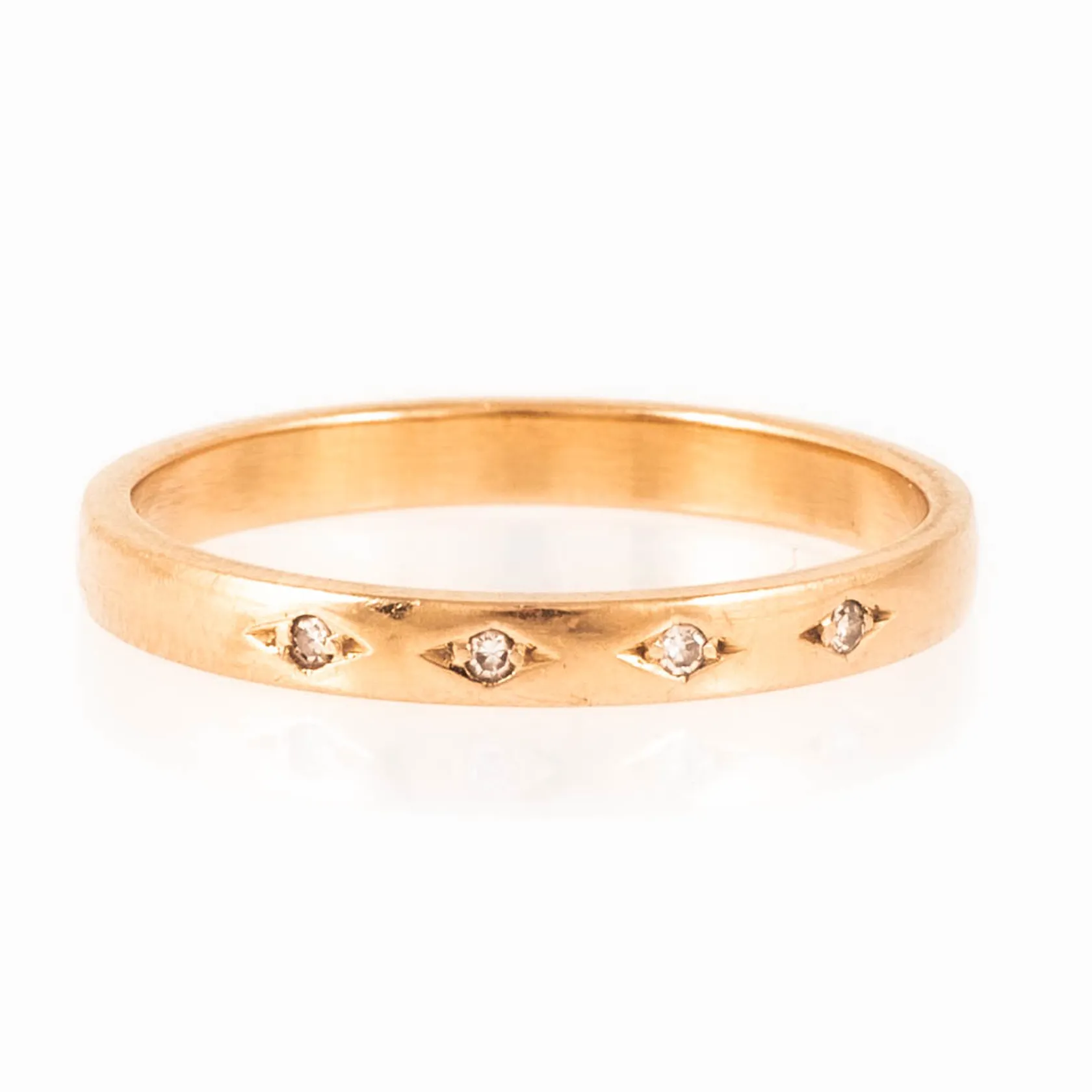 Ring i 18K guld med 4 x 0,005ct åttkantslipade diamanter. Den är i storlek 17½, är 2,5 mm bred och väger 2,4g. Stämplad Q10 (1990), WAD (HB Wadring-Juvel, Karlskrona), 18K & kattfot. Stenstorlek graverad 0,02ct. Vikt: 2,4 g.