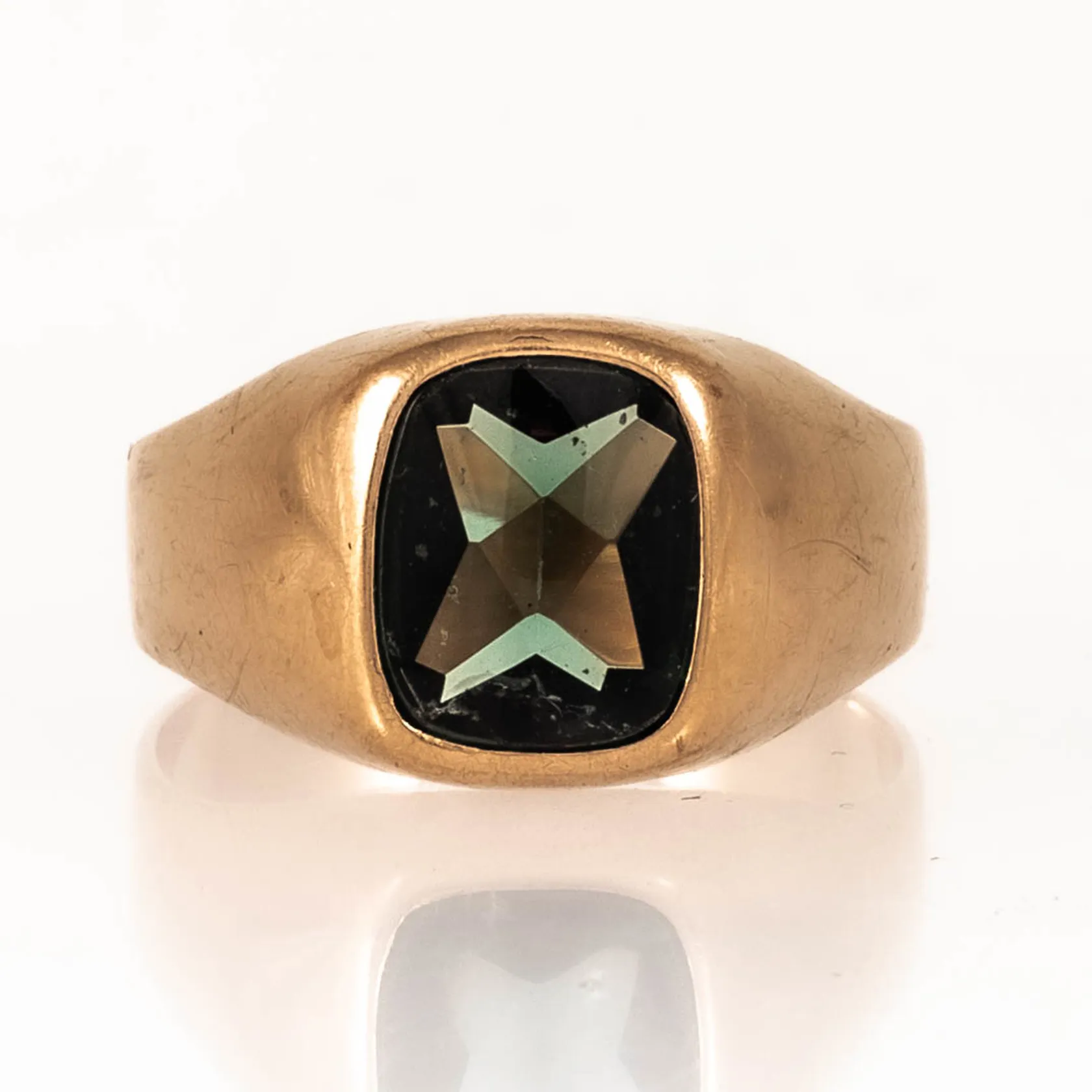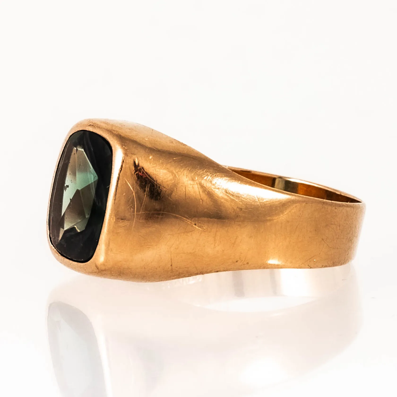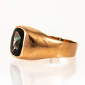 Klackring i 18K guld med grön sten. Den är i storlek 22½, är 5,2 - 14 mm bred och väger 7,2g. 18K & kattfot. Stämplad HSG, kattfot, 18K, P9 (1965). Vikt: 7,2 g.