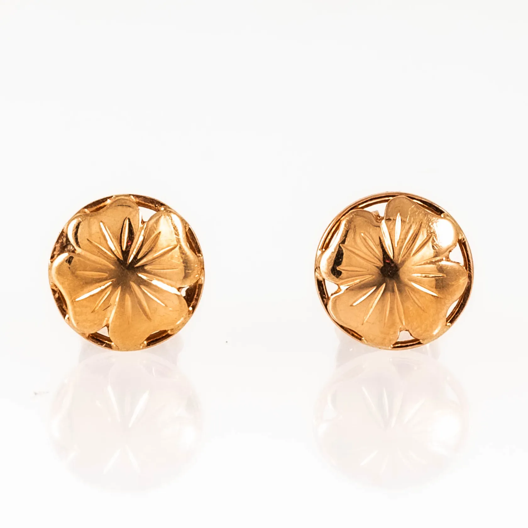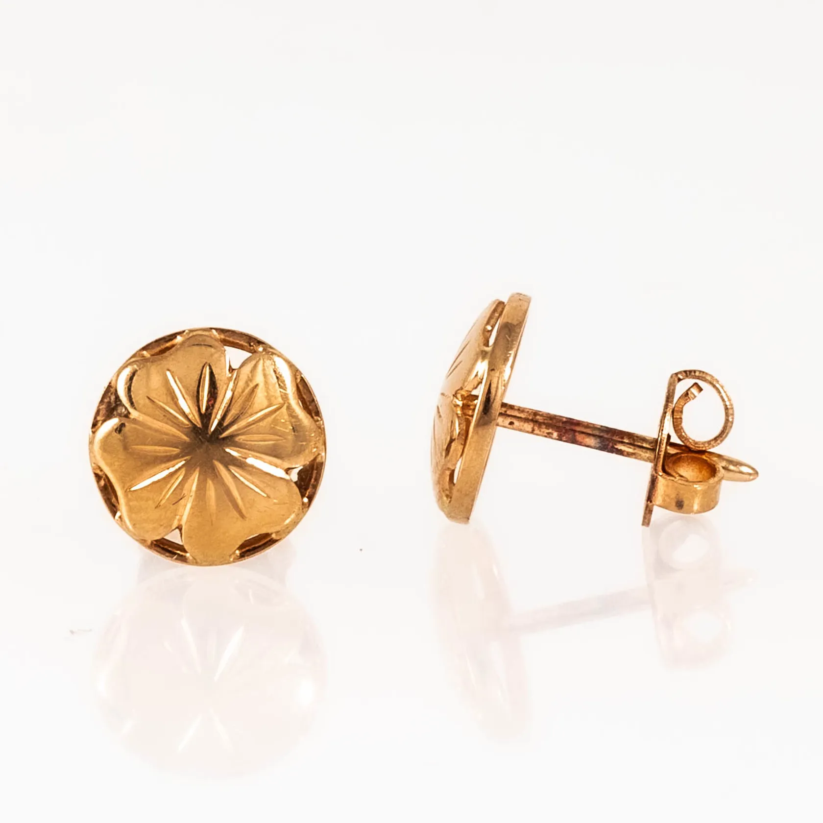 Örhängen i 18K guld med ett graverat blomstermönster. De är Ø 8,5 mm och väger 1,6g. Tre-vingade snurrebussar. Vikt: 1,6 g.