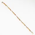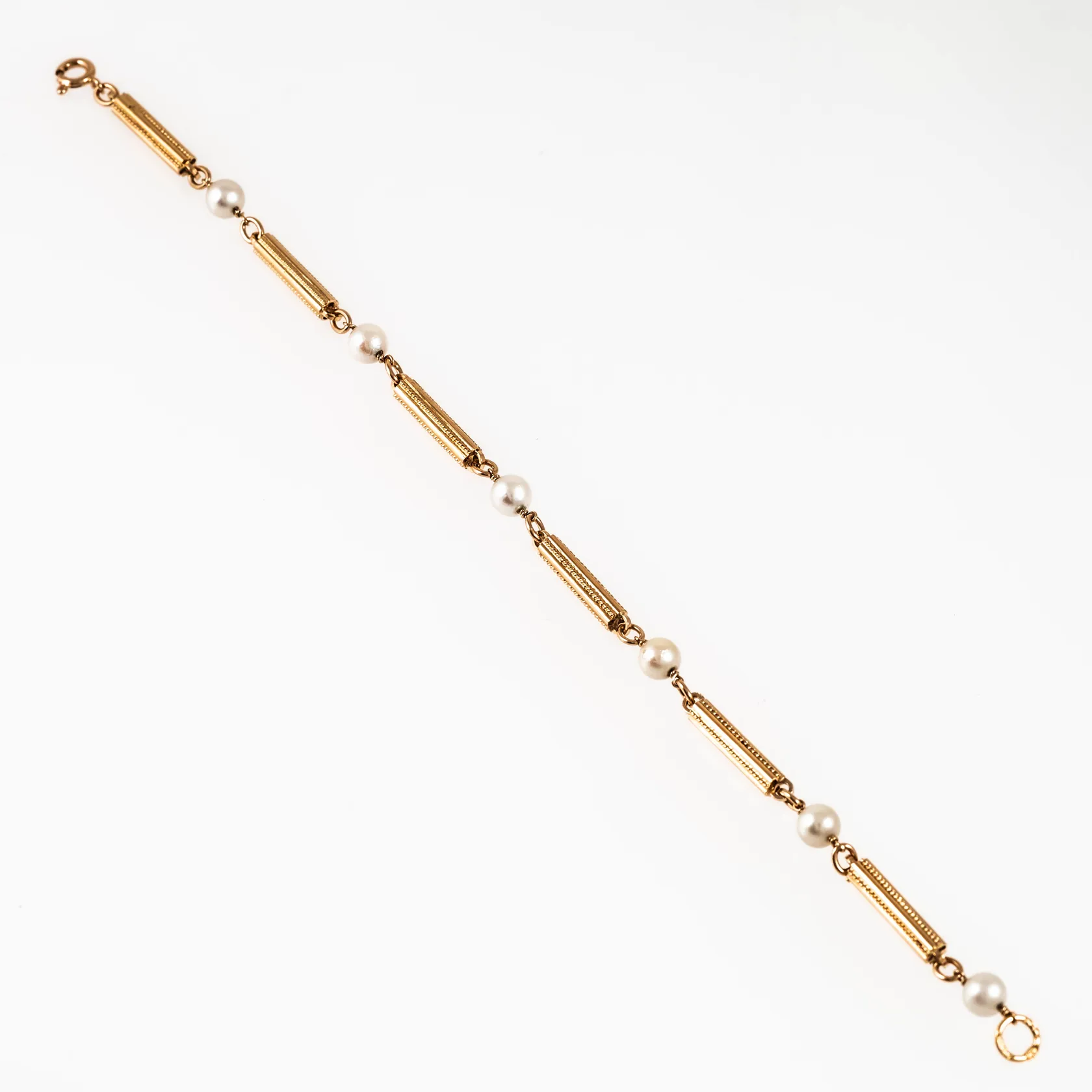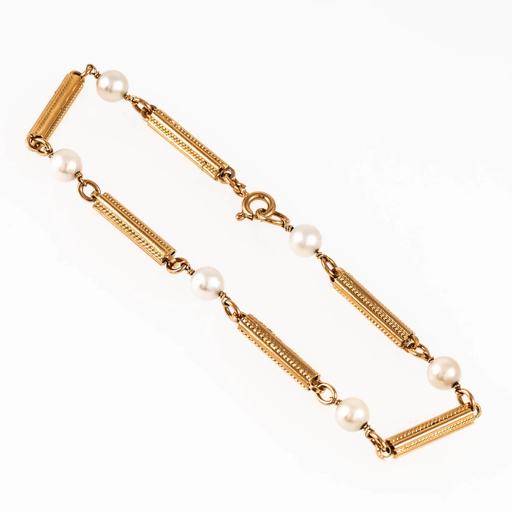 Stavarmband i 18K guld med sex odlade pärlor Ø 5,2 mm. Det är 20 cm långt, 3,3 - 5,2 mm brett och väger 8,6g. Stavarnas längd 15 mm. Stämplat ESM (Svedboms i Vetlanda) 18K & kattfot. Springring. Vikt: 8,6 g.