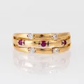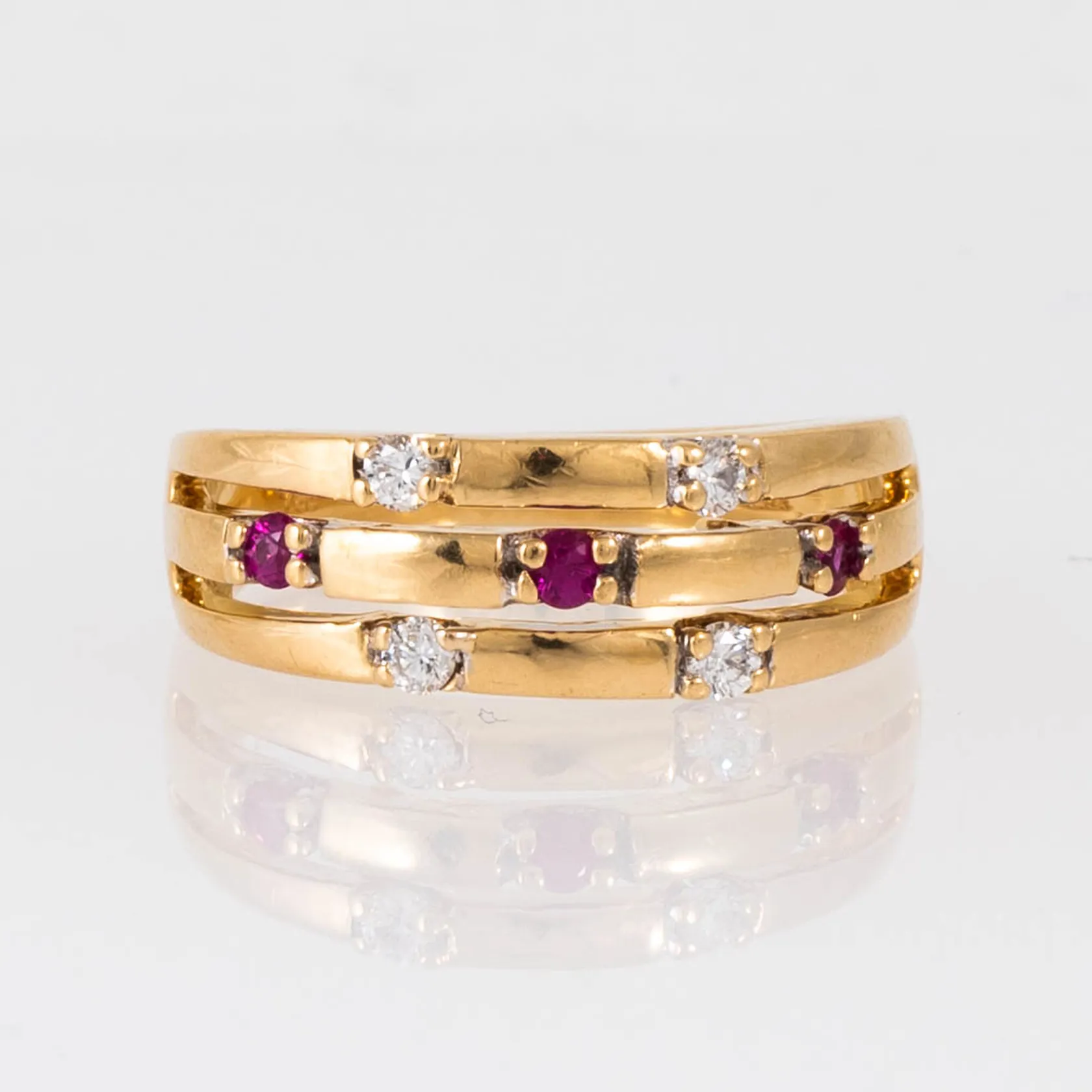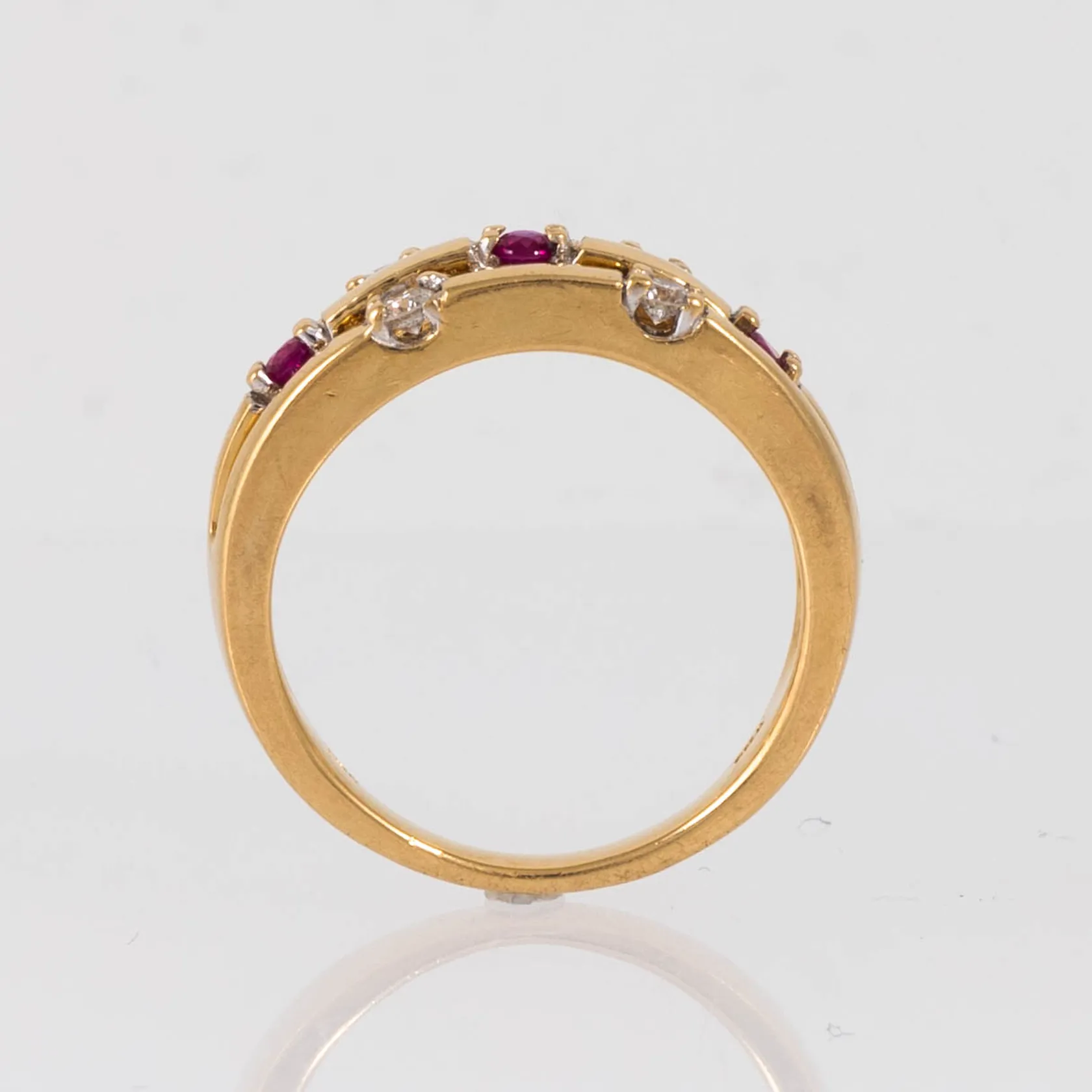 Ring i 18K guld med 4 x ca 0,03ct briljantslipade diamanter & 3 rubiner Ø 2 mm. Den är i storlek 17, är 2,7 - 7,2 mm bred och väger 7,0g. Stämplad GHA, 750. Vikt: 7 g.
