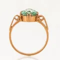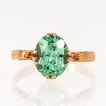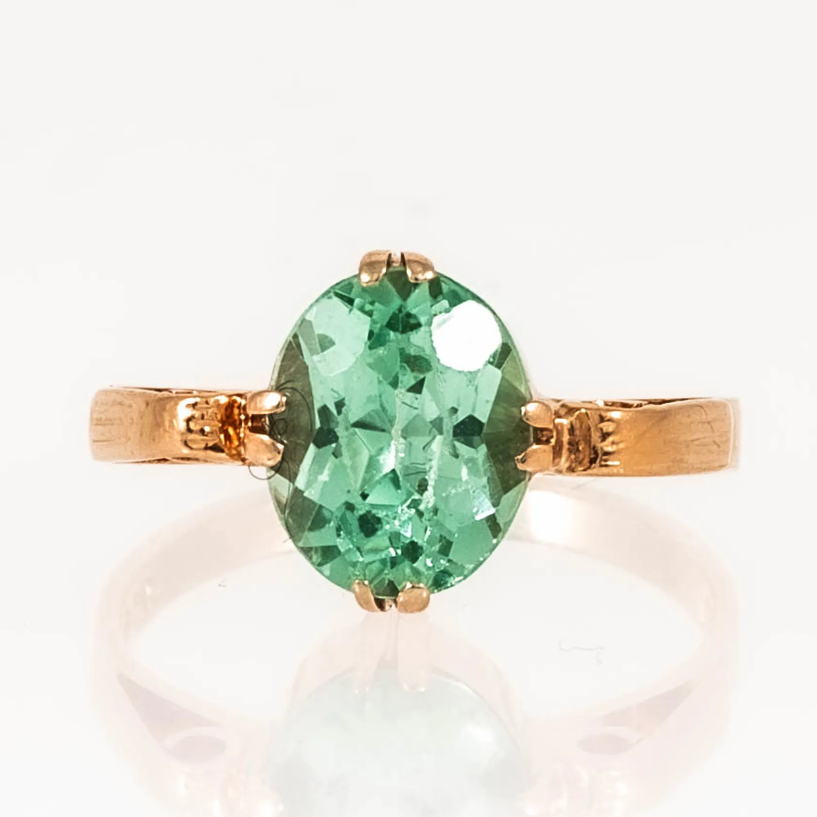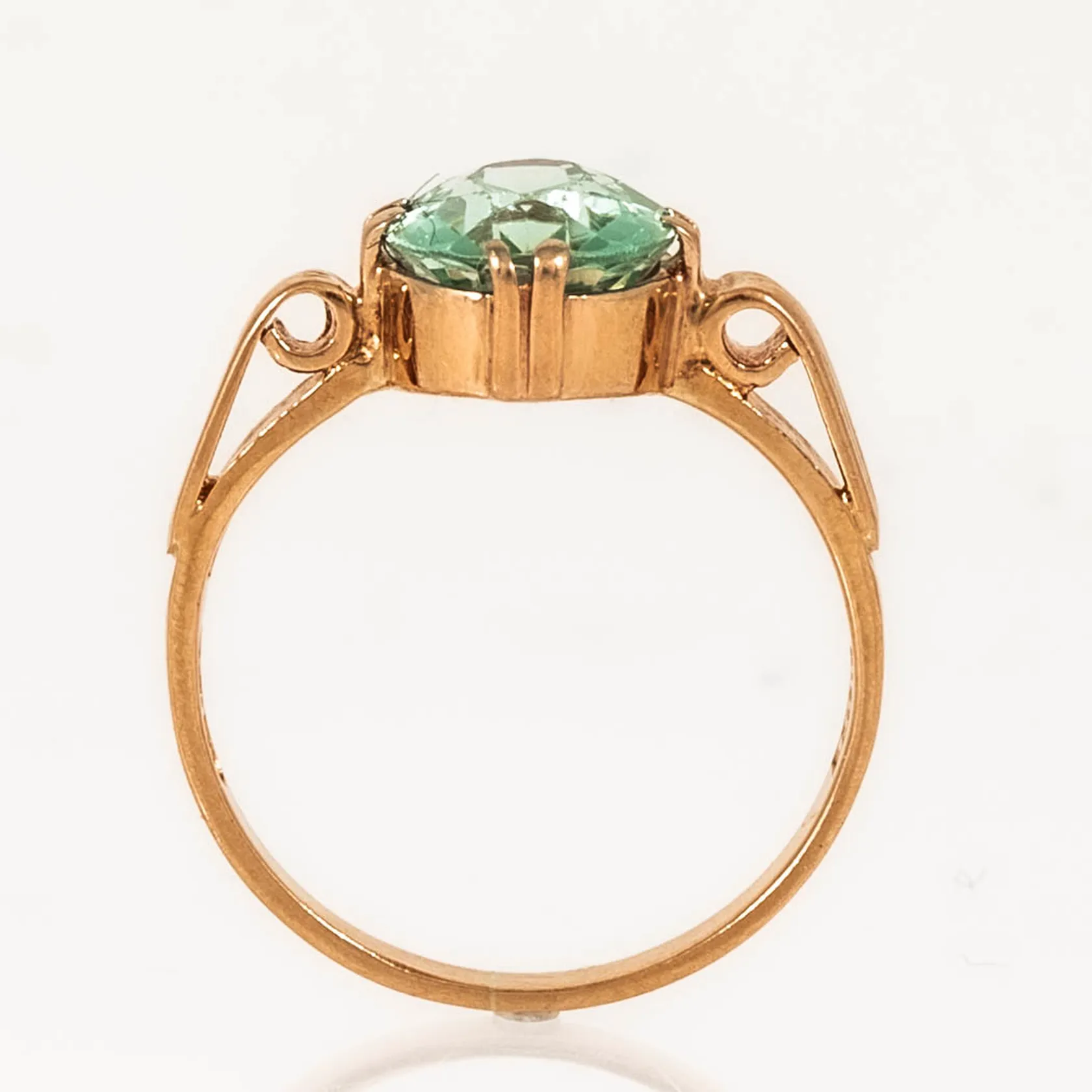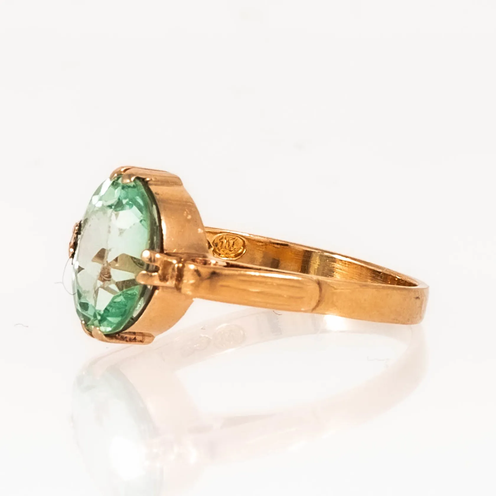 Umeåtillverkad ring i 18K guld med en härligt mintgrön sten (lite nött). Den är i storlek 16¾, är 2 - 10 mm bred och väger 2,9g. Stämplad FK (Kjellins Guld), kattfot, Umeås stadsstämpel, 18K & V8 (1947). Vikt: 2,9 g.