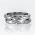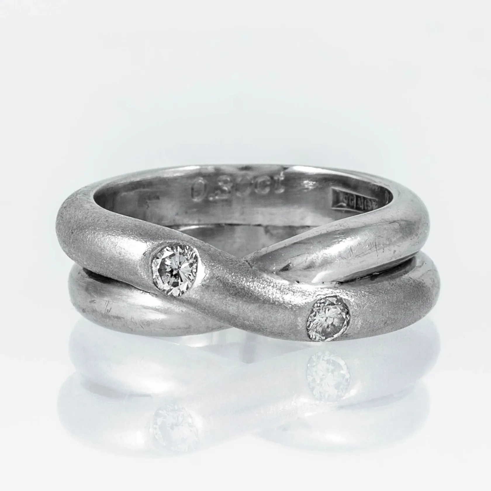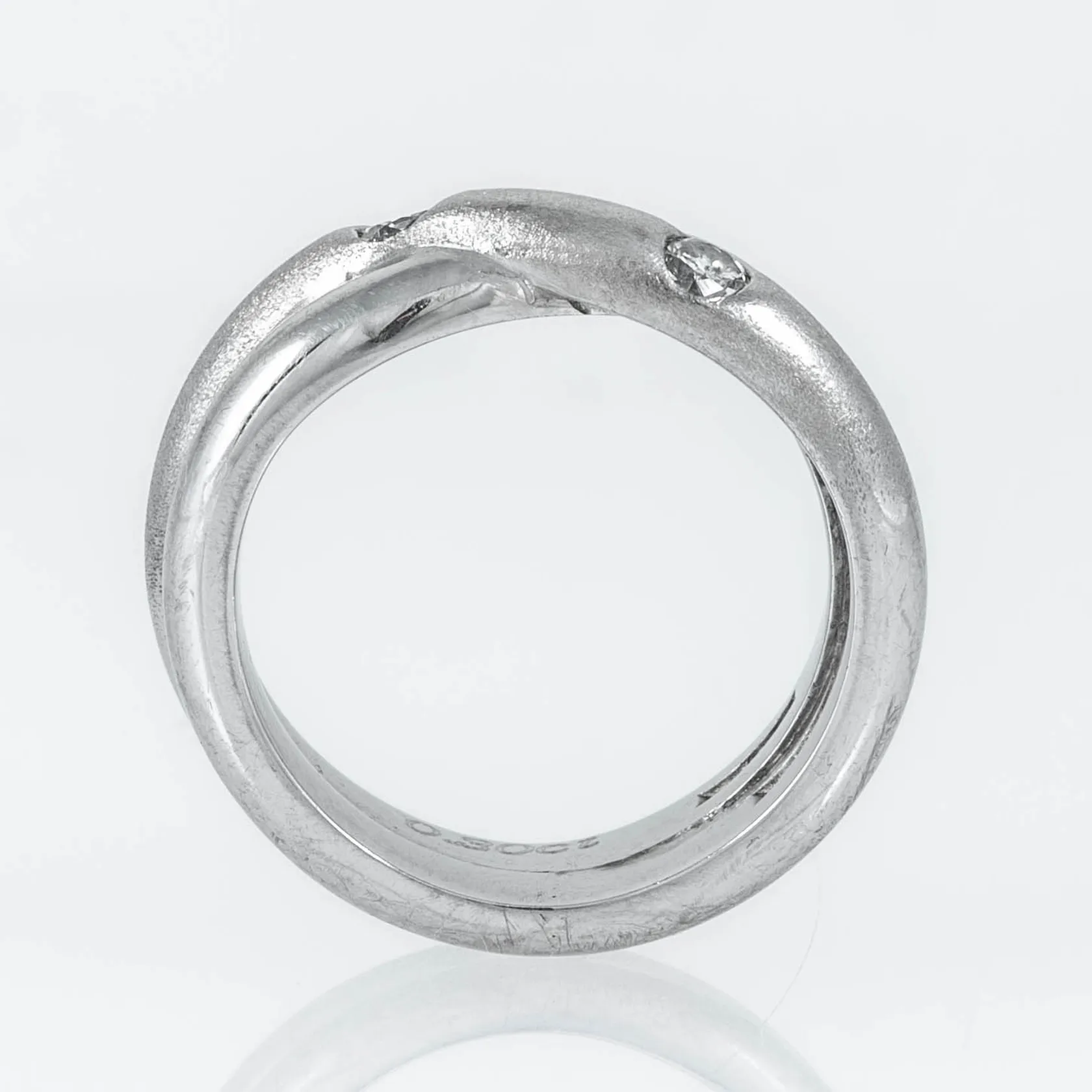 Kraftig ring i 18K vitguld: delvis matterad med två briljantslipade diamanter á c:a 0,15ct (c:a W/Pique) . Den är i storlek 18¾, är 4,5 - 8 mm bred och väger 16,2g. Stenstorlek 0,30ct ingraverat. Stämplad OG (Odenguld AB, Köping), 18K. Vikt: 16,2 g.