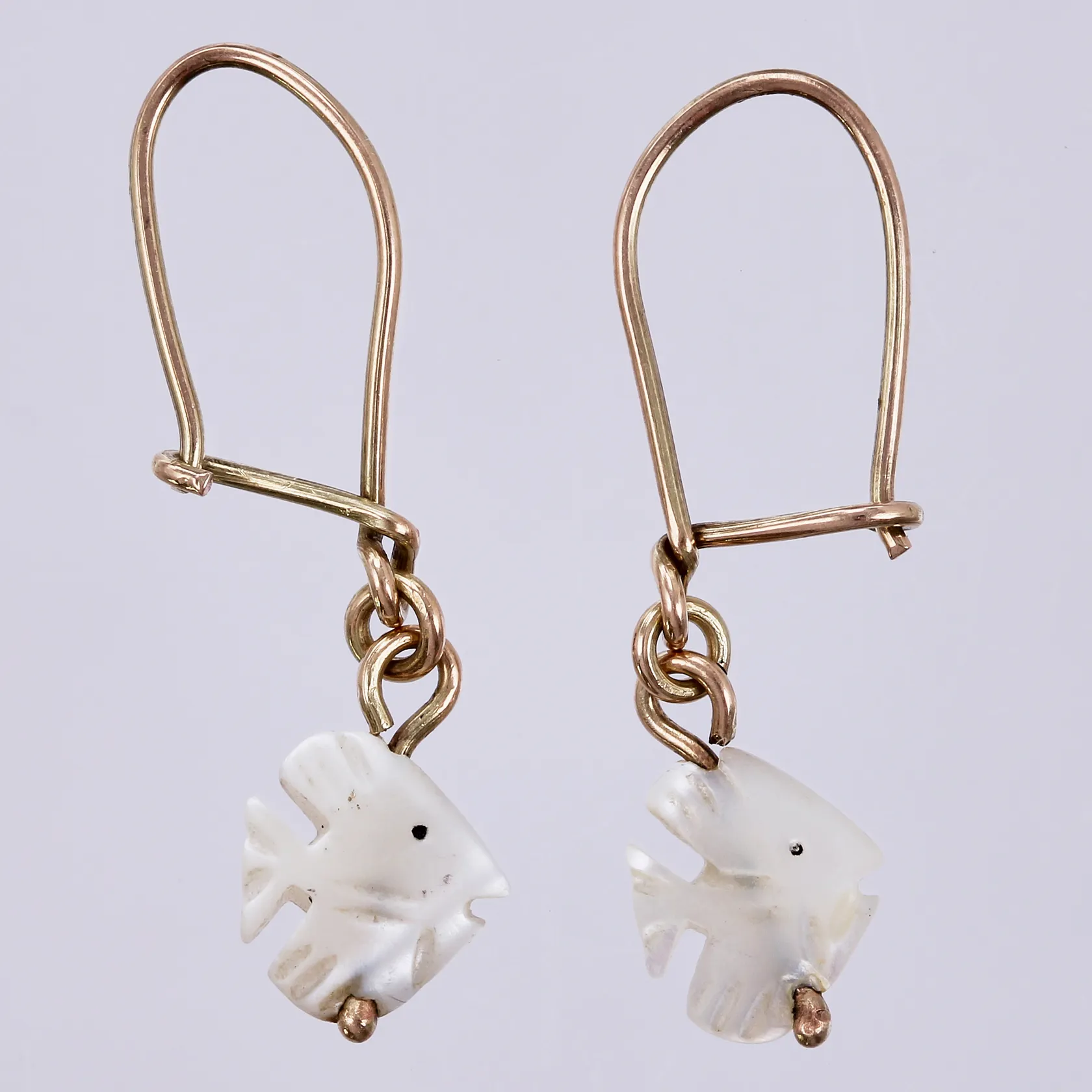 Ett örhängen med fisk formade stenar