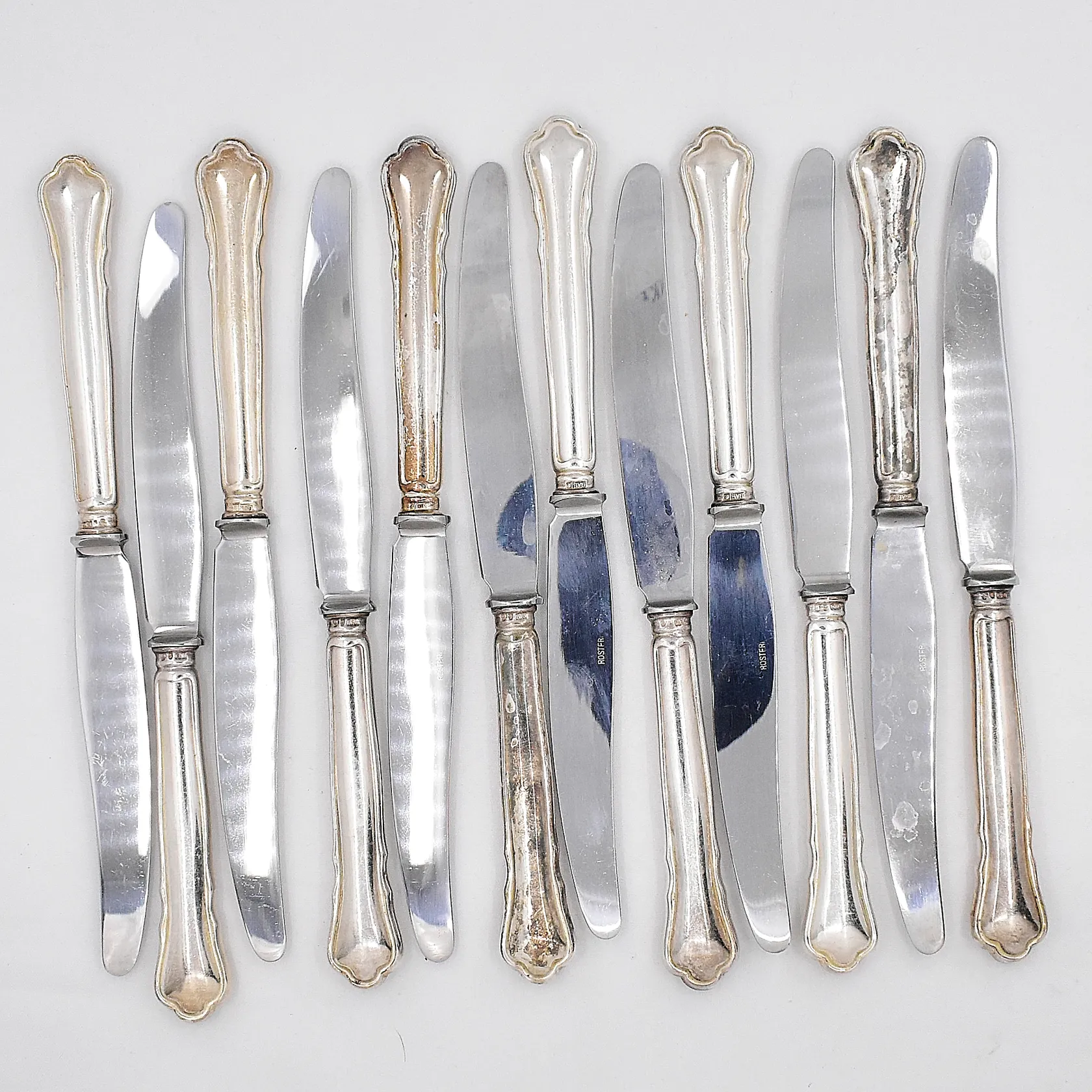 12 Matknivar, modell Chippendale, längd 20cm, bruksskick, schatull, silver 830/1000, bruttovikt 657,4g Vikt: 657,4 g.