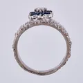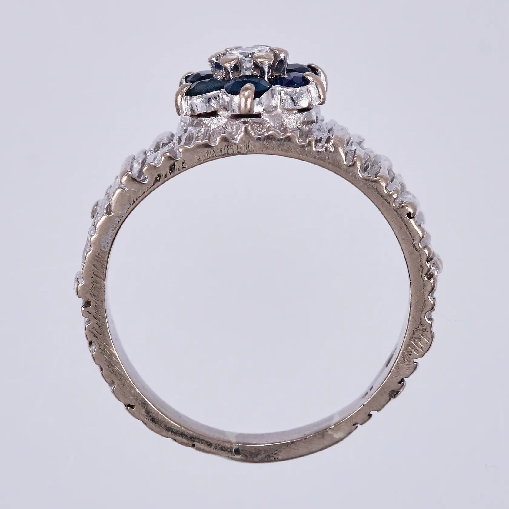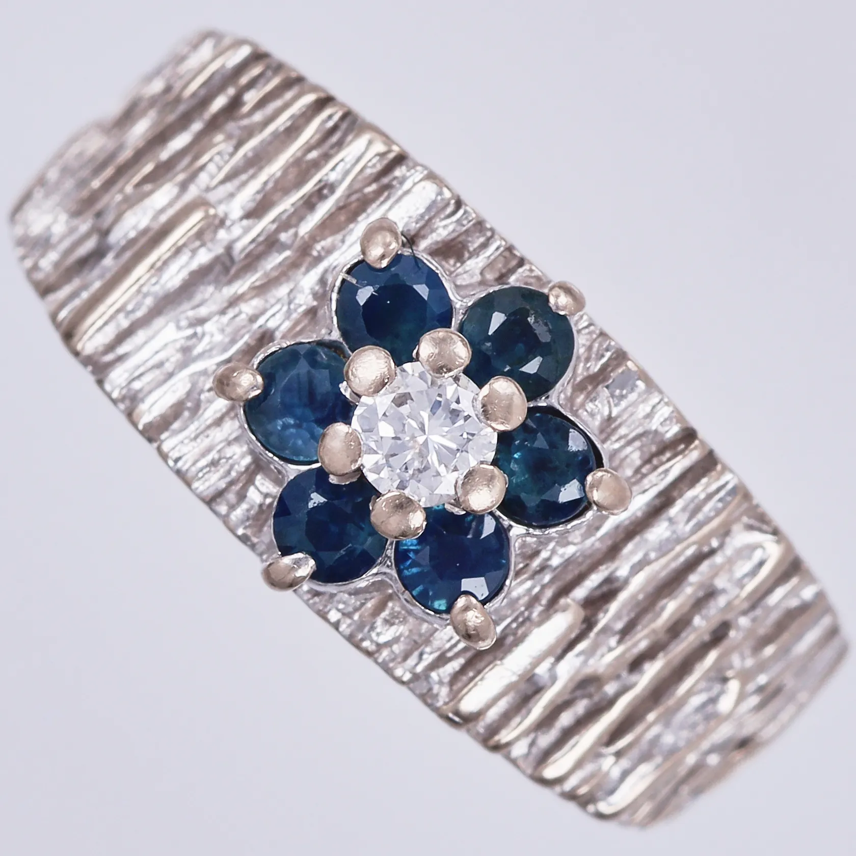 Ring med diamant ca 1x0,10ct samt med mörkblåa stenar, stl: 16¼, bredd: ca 2-8mm, 14K Vikt: 6,9 g.