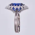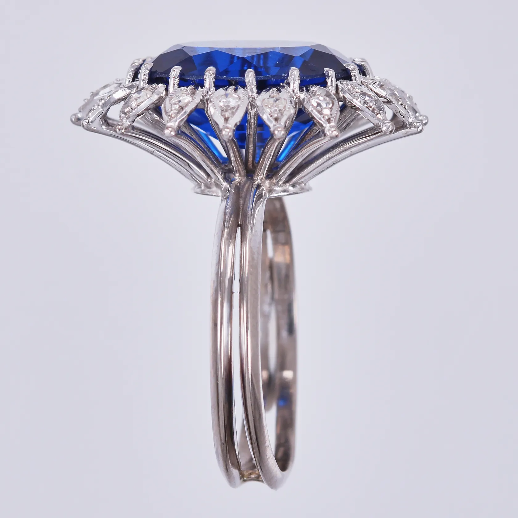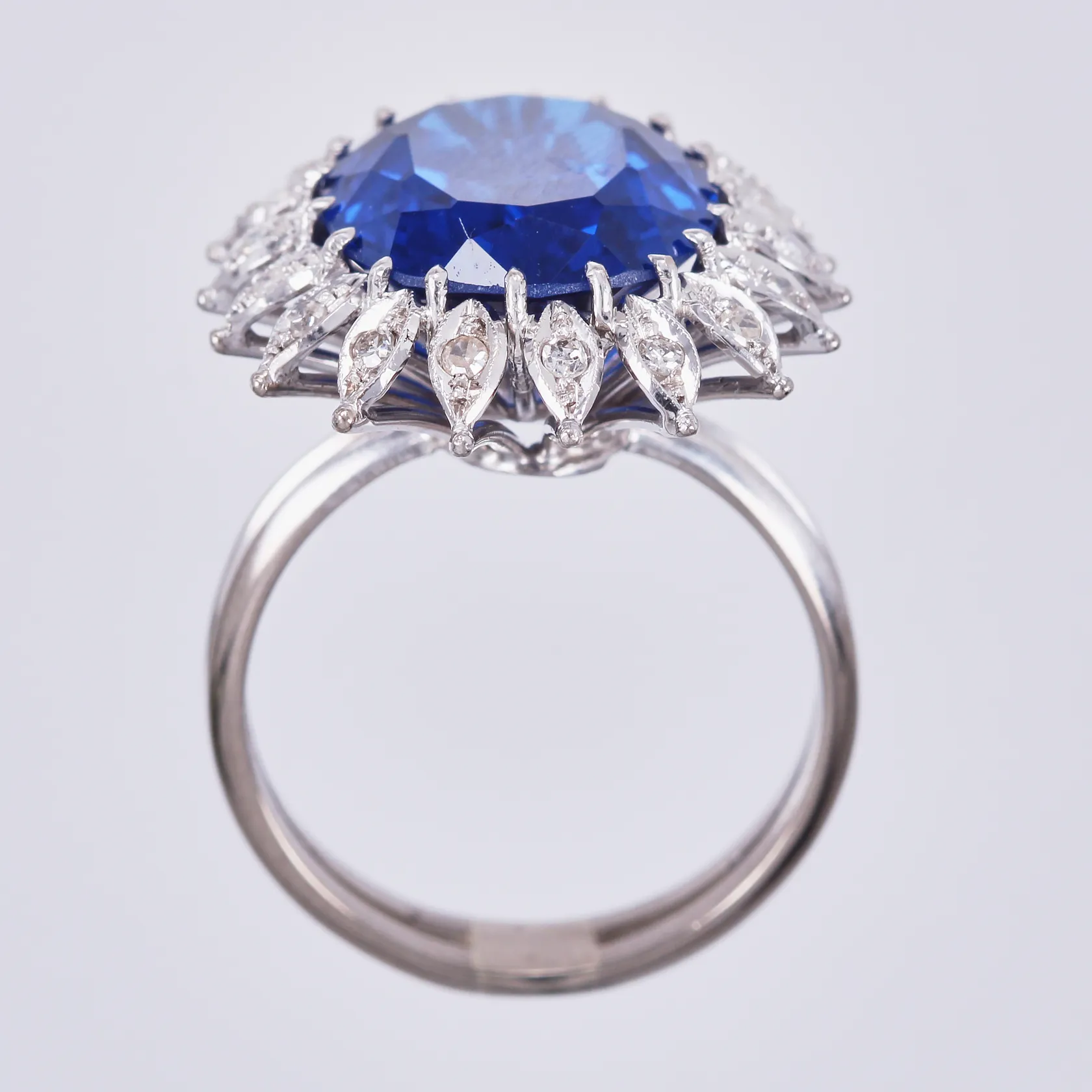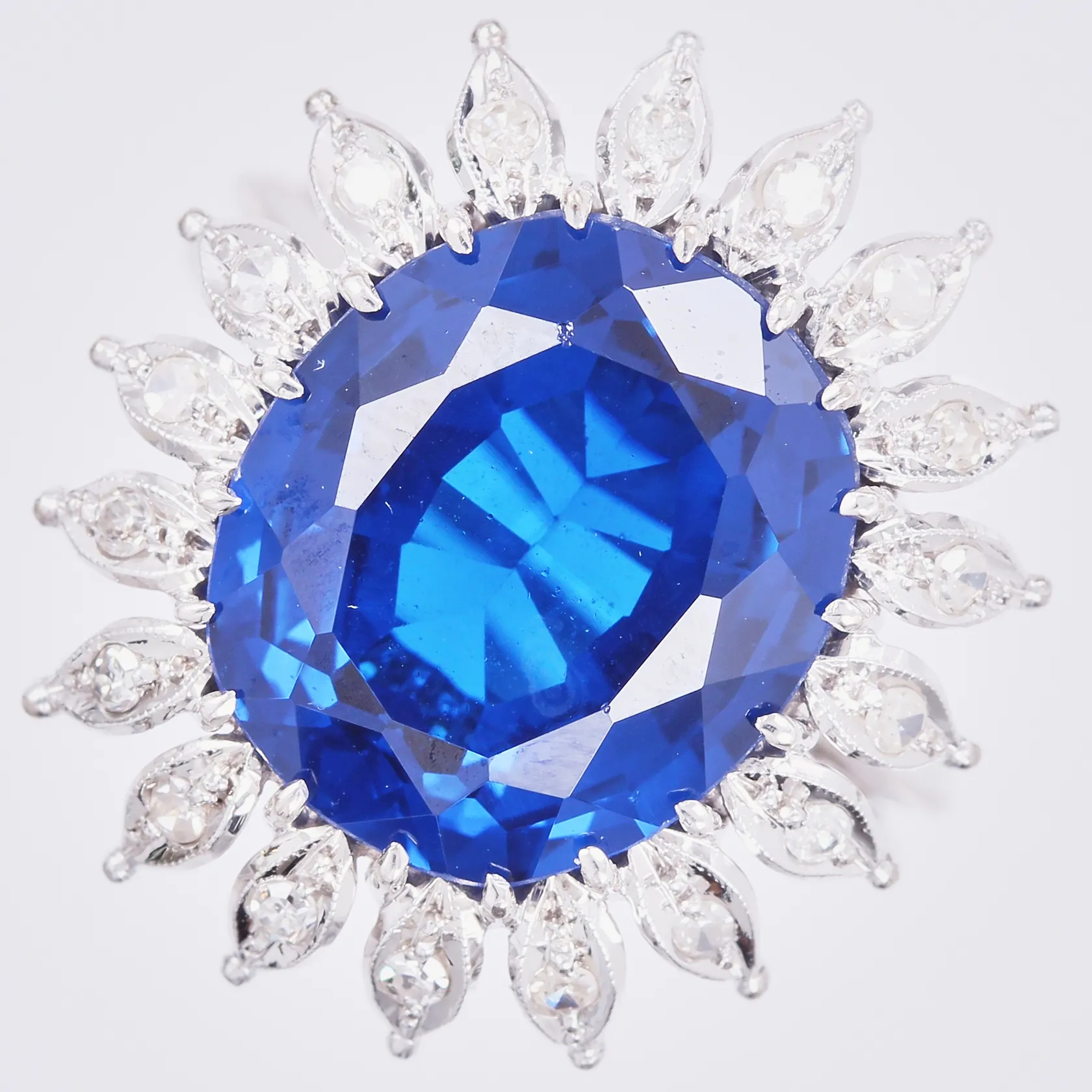 Ring med blå syntetisk spinell, diamanter ca 18x0,01ct, åttkantslipade piké, stl: 17¾, bredd: ca 2-20mm, vitguld, 18K Vikt: 7 g.