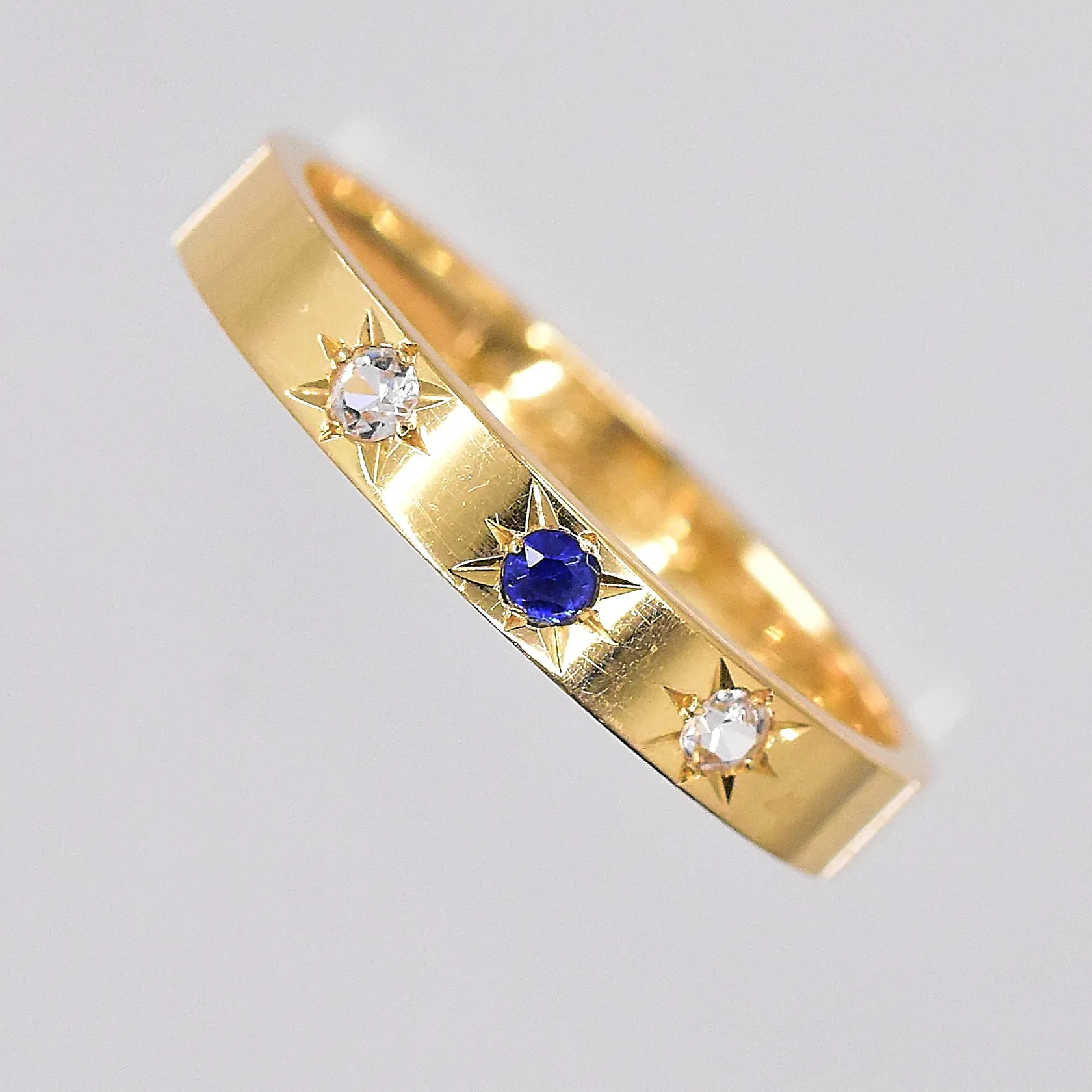 Ring med blå och vita stenar, stl 17, gravyr, 18K Vikt: 2,6 g.