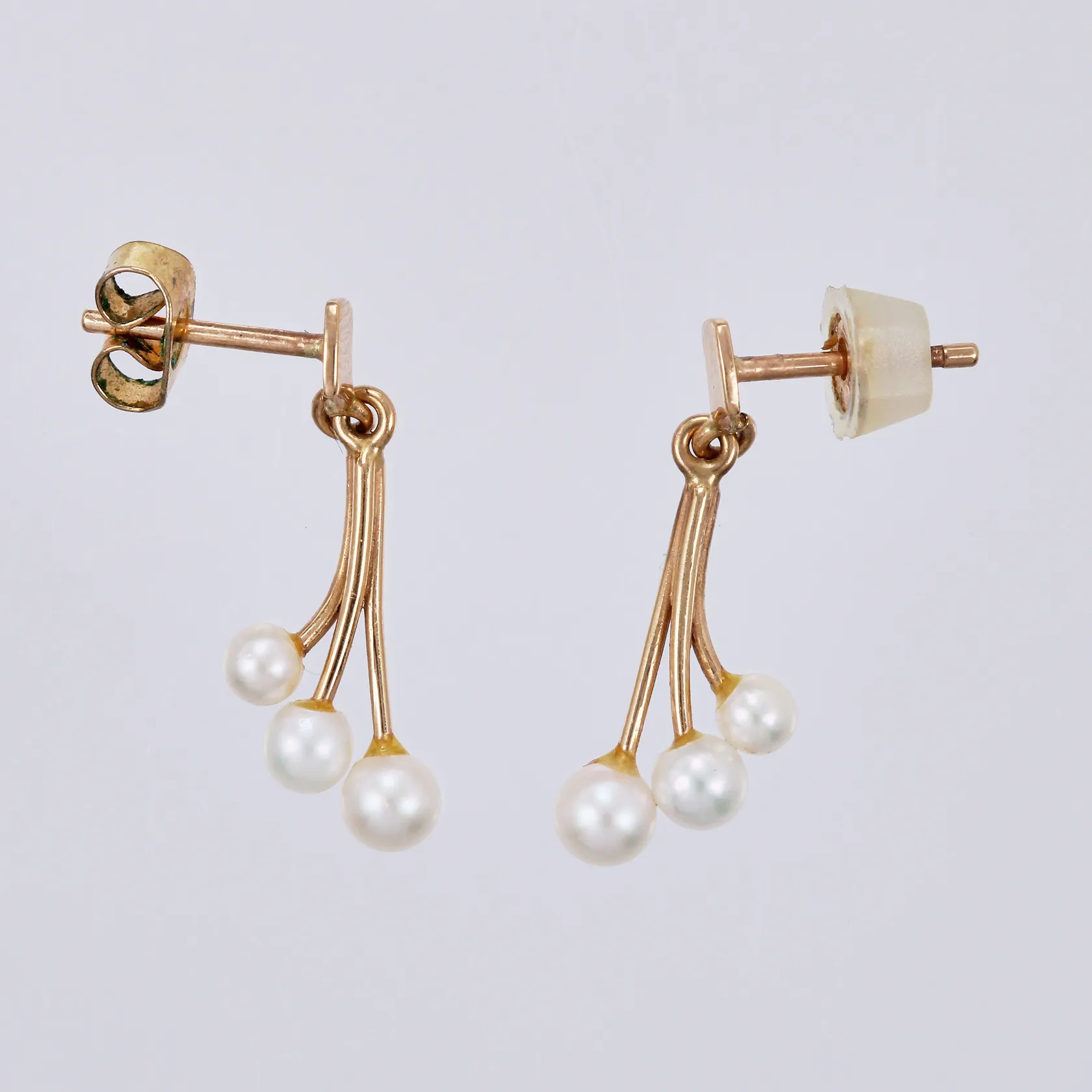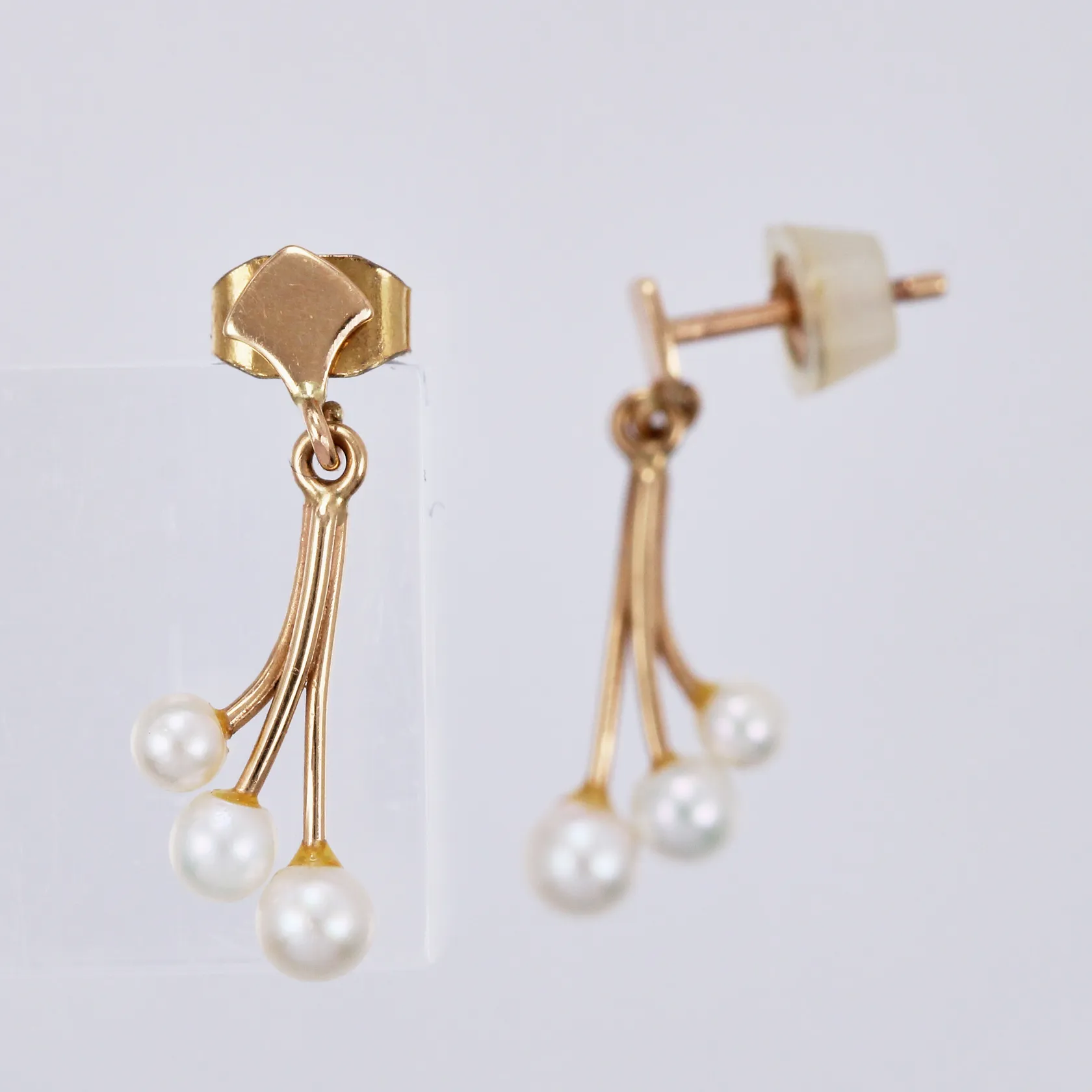 Ett par örhängen med odlade pärlor, längd: ca 2cm, bredd: ca 2-8mm, udda stoppers, 18K Vikt: 1,3 g.