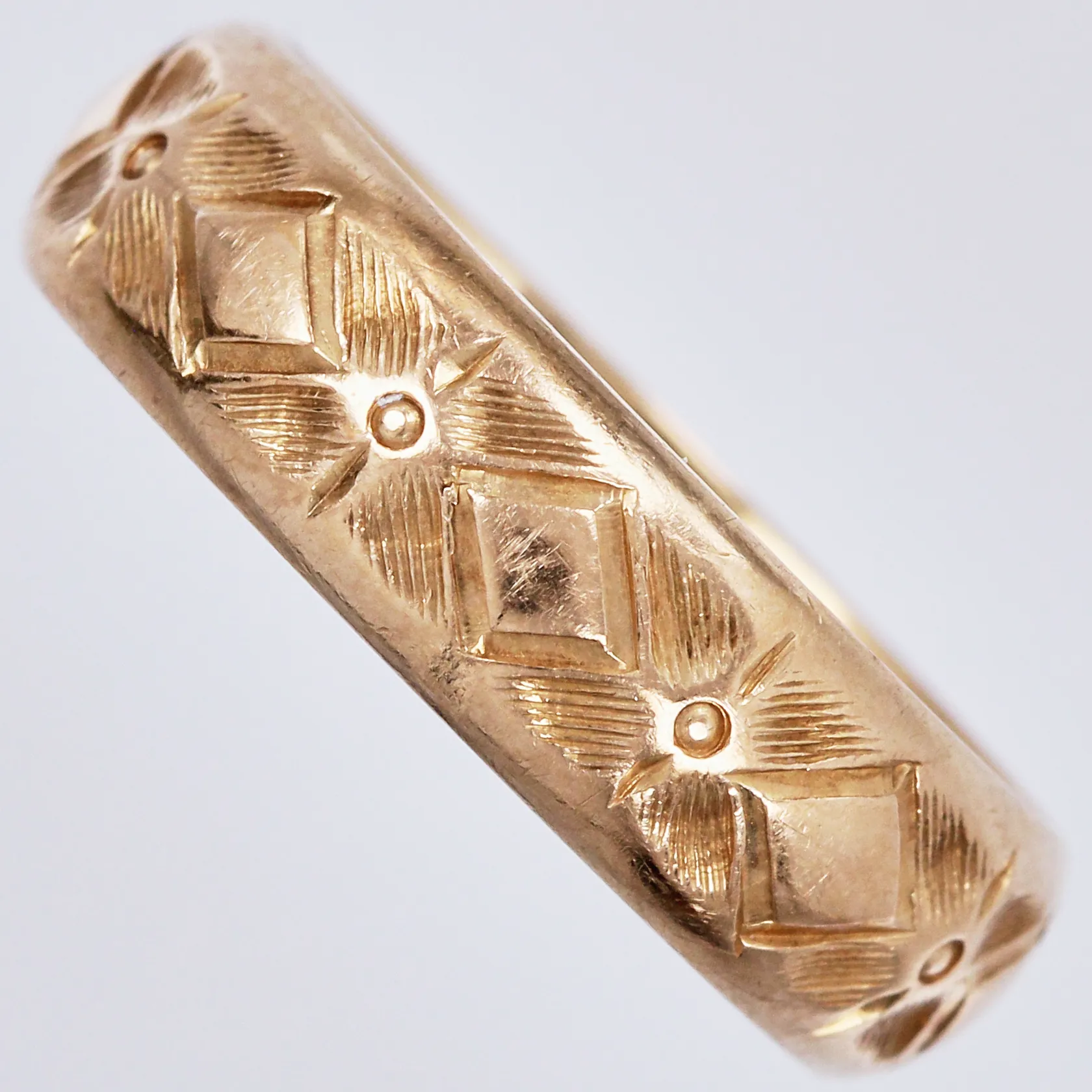 Ring mönstrad, stl: ca 18, bredd: ca 5mm, GHB, Björkmans Guldsmedja, Norrköping, år 1967, 18K Vikt: 5,2 g.